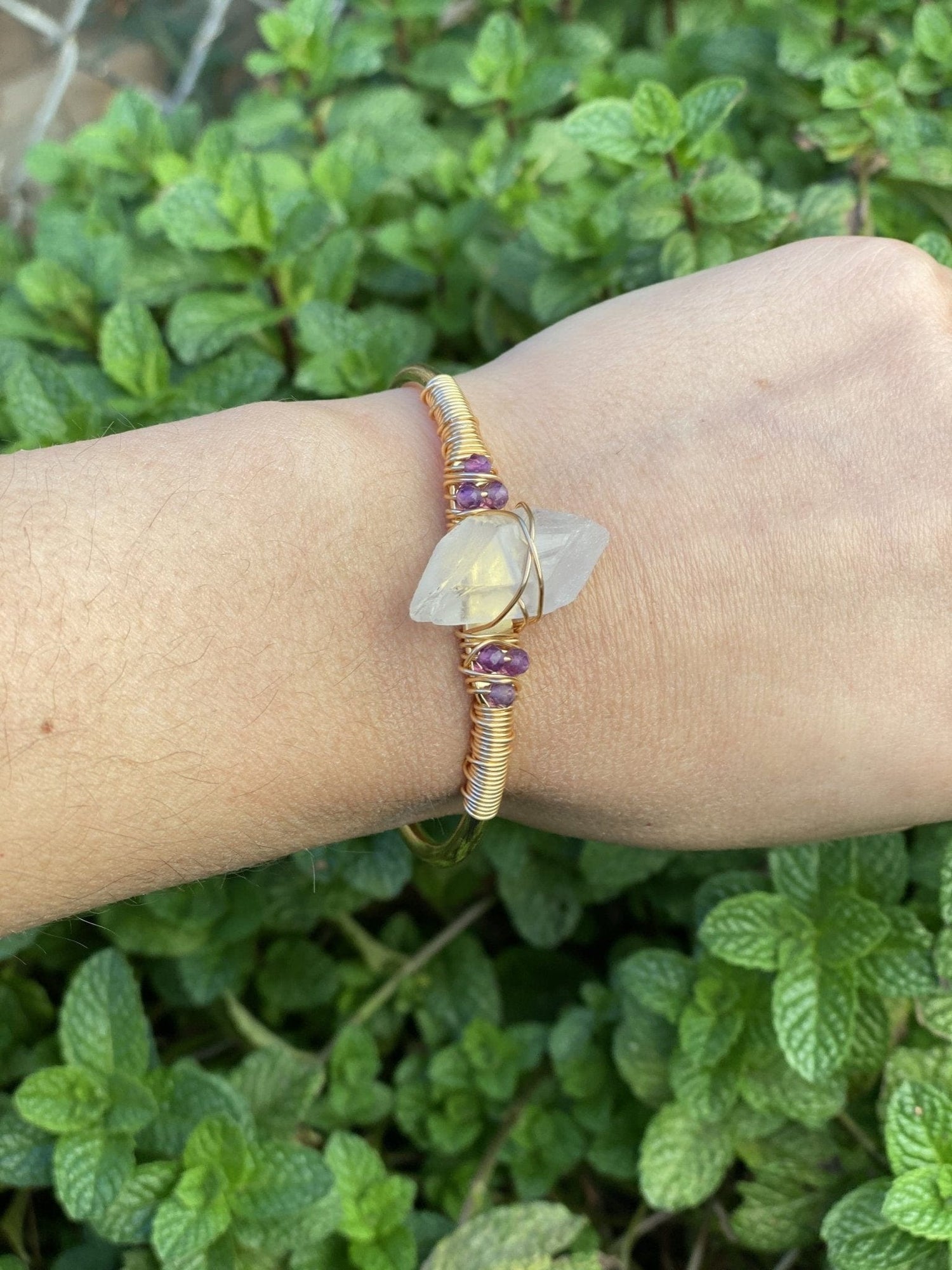 For all of you who are looking for a boho chic accessory that goes with anything, this is it! This delicate hand-wire bracelet will make any outfit look chic. The most important part of this is the double terminated clear quartz. This is the best type if you are looking for a crystal to help with manifesting your desires.