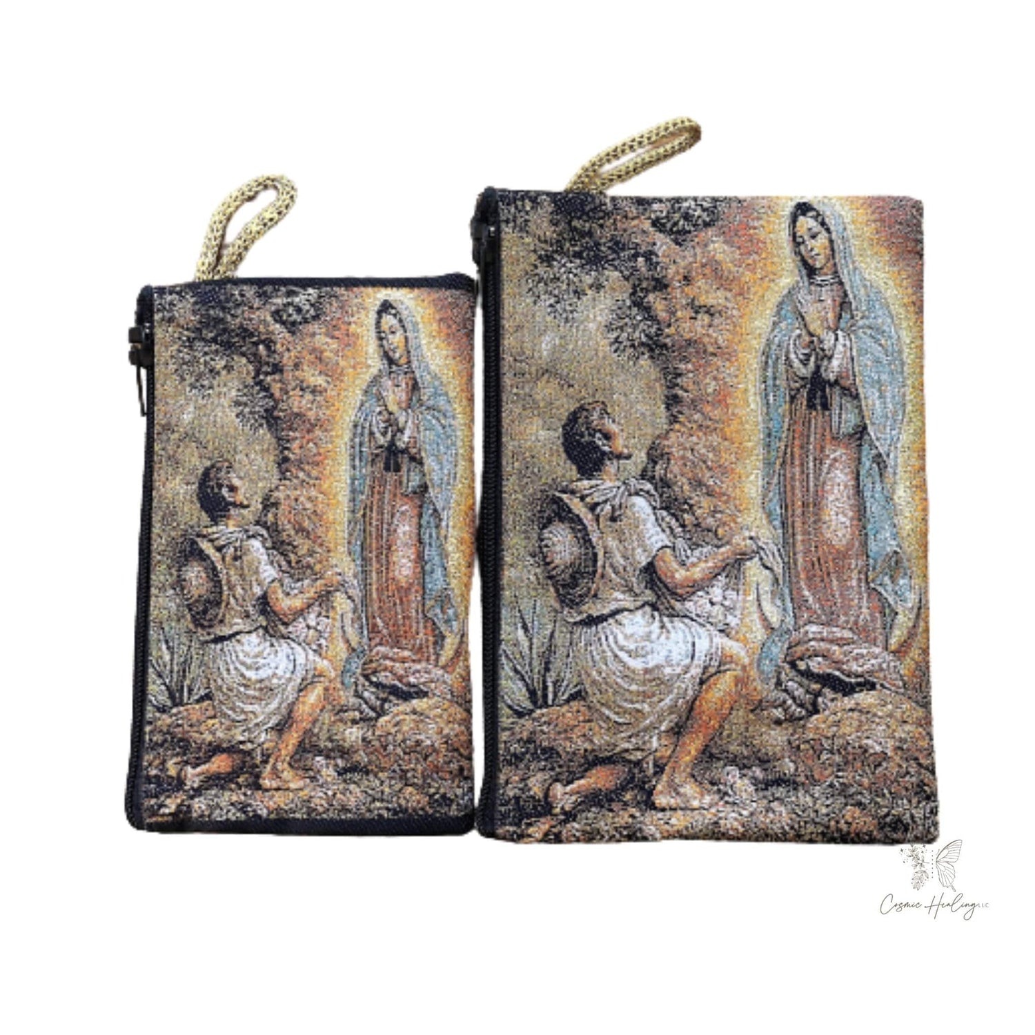 The exquisite Woven Virgen de Guadalupe & Juan Diego Tapestry Rosary Bag, your perfect companion to keep your cherished rosary safe and secure. Crafted with utmost care, this beautiful tapestry bag features a devotional image of the Woven Virgen de Guadalupe & Juan Diego on both the front and back, ensuring a constant reminder of faith and protection.