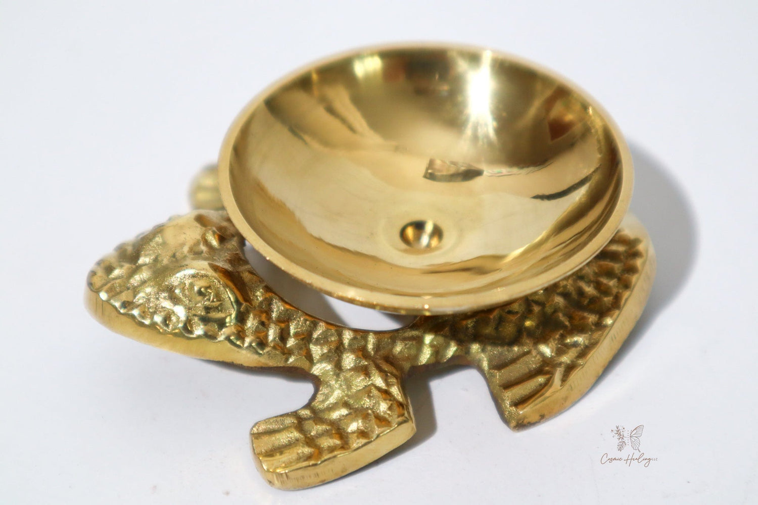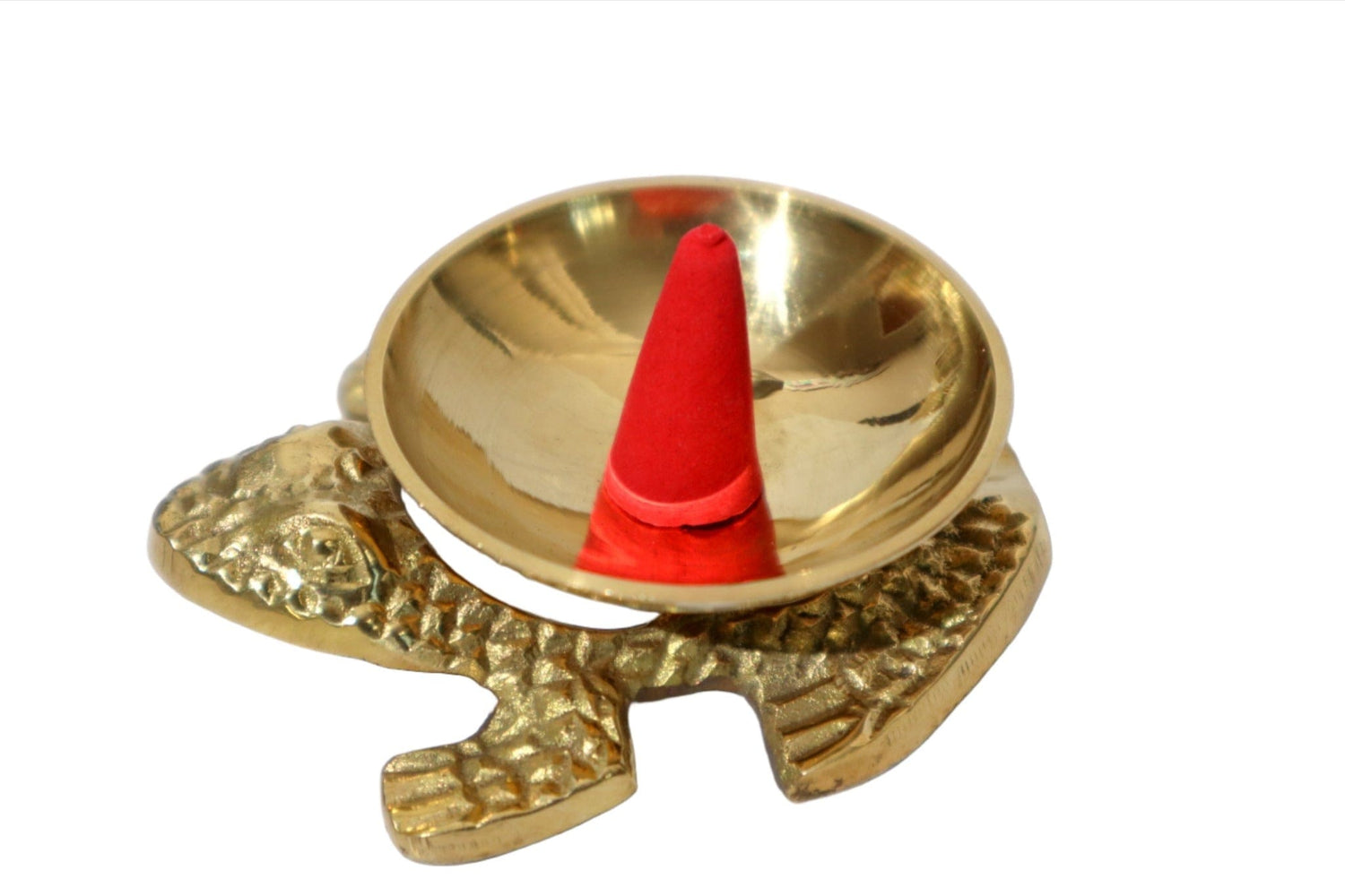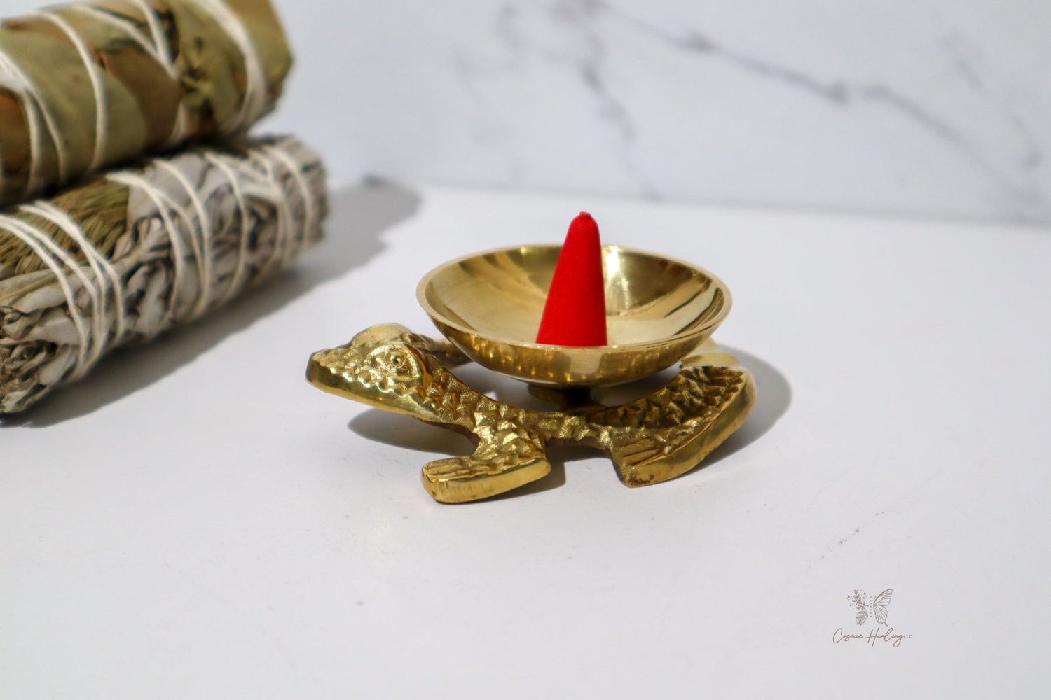 This golden frog cone incense burner is a unique way to burn your favorite cone incense and resins while incorporating spirit animal totems into your meditation rituals. A burner is an important accessory for any ceremonial use of incense. Burners are used for the safe and controlled burning of cone or stick incense. This brass frog burner is ideal for either cone.