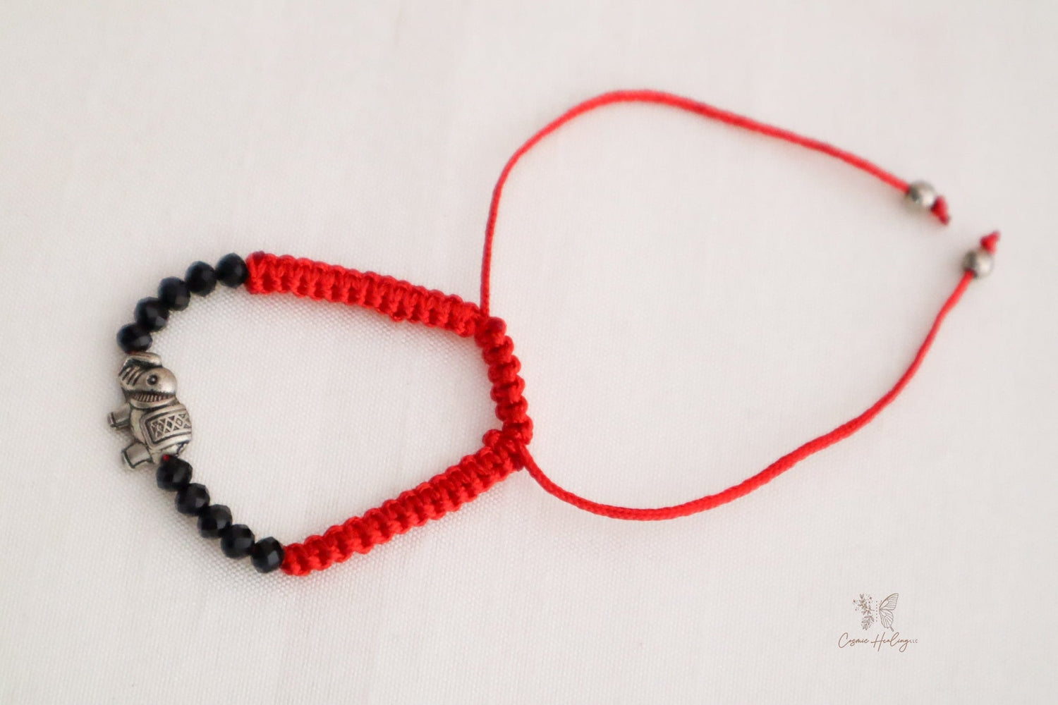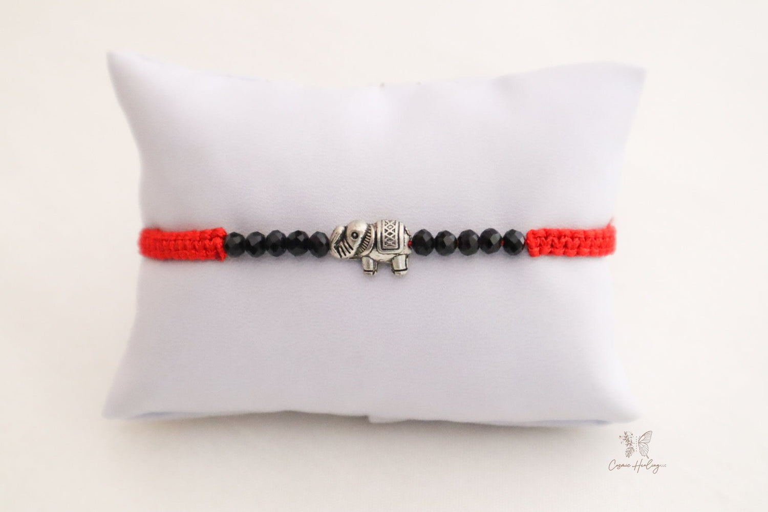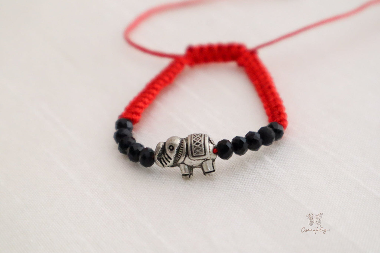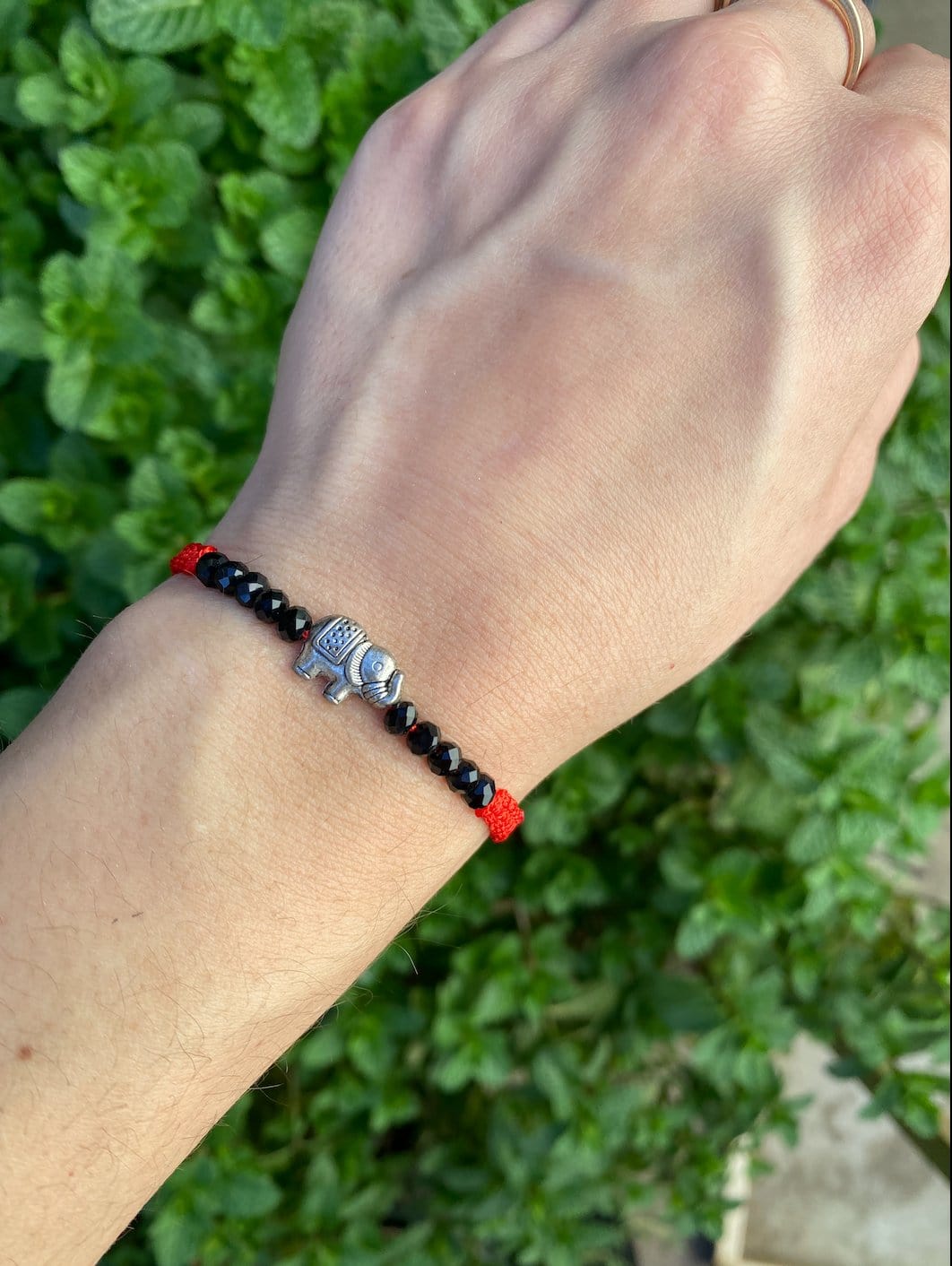 Handmade with love, this delightful bracelet features faceted black beads that create a beautiful contrast against a vibrant red thread. At the center, a tiny elephant charm symbolizes good luck and wisdom, making this piece both stylish and meaningful.