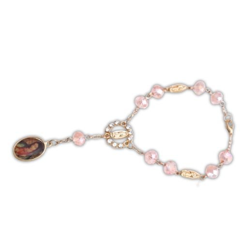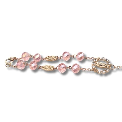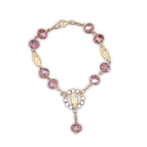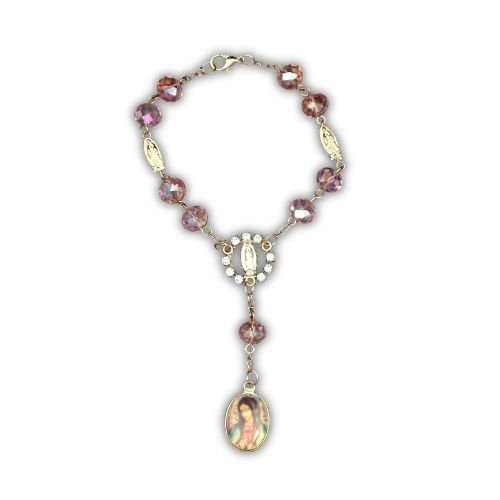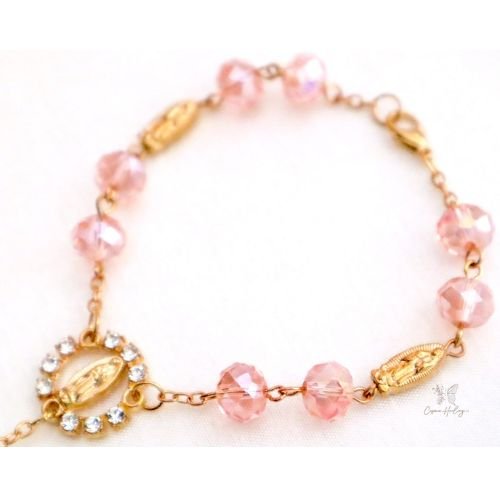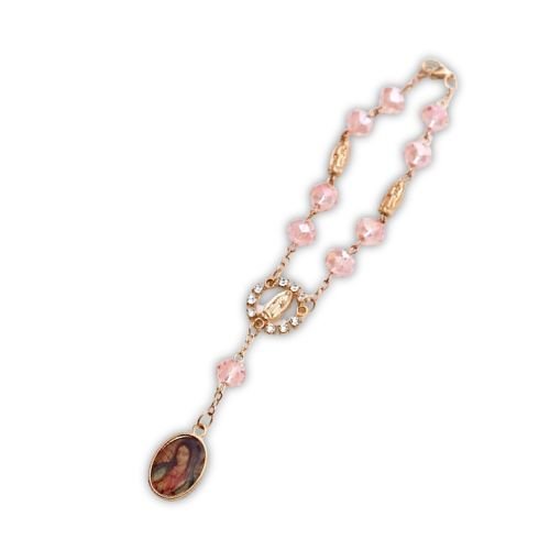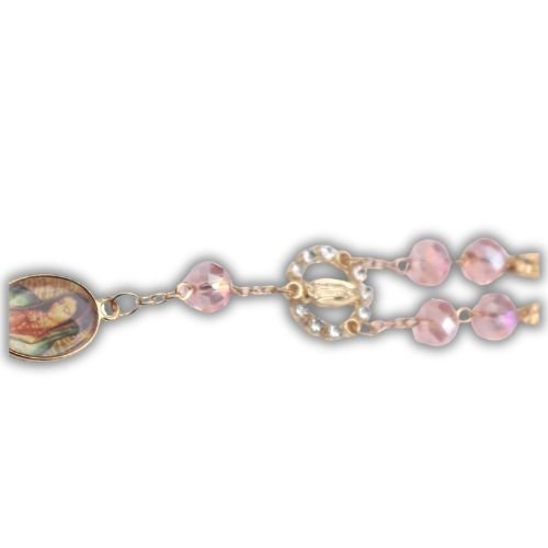 This Lady of Guadalupe car rosary brings a touch of faith and protection to your travels. Handcrafted in Mexico with love, it features delicate pink crystal beads, two Virgen de Guadalupe medals, and a durable gold-tone metal chain. Made with high-quality alloy, plastic beads, and rhinestones, this car charm is built to last, resisting wear and tear.