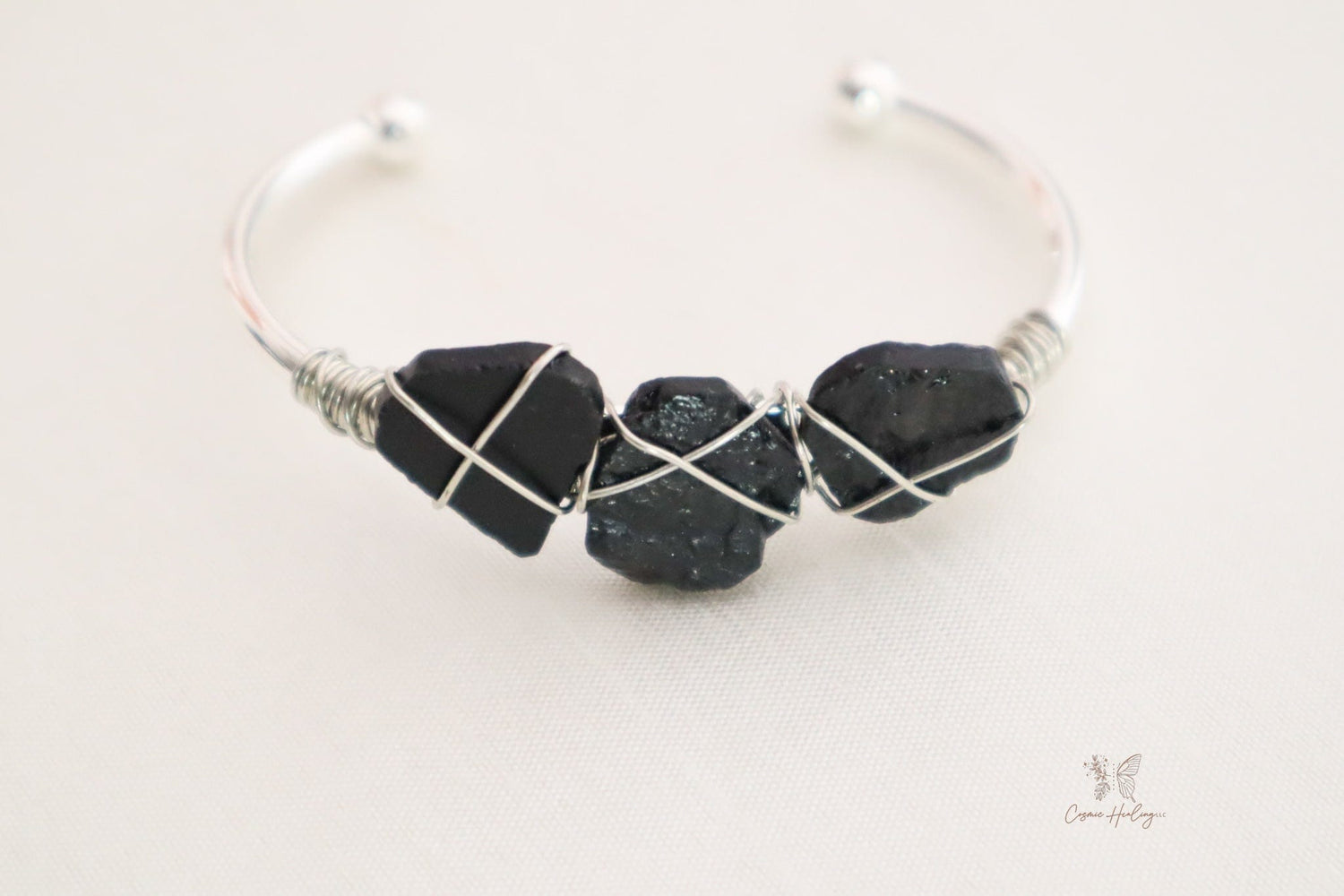 Raw Black Tourmaline Open Cuff Bangle made of three gorgeous Raw Black Tourmaline gemstones wrapped securely in criss-cross style in a unique caged design and attached to a hand formed bangle to create the perfect open cuff bracelet.