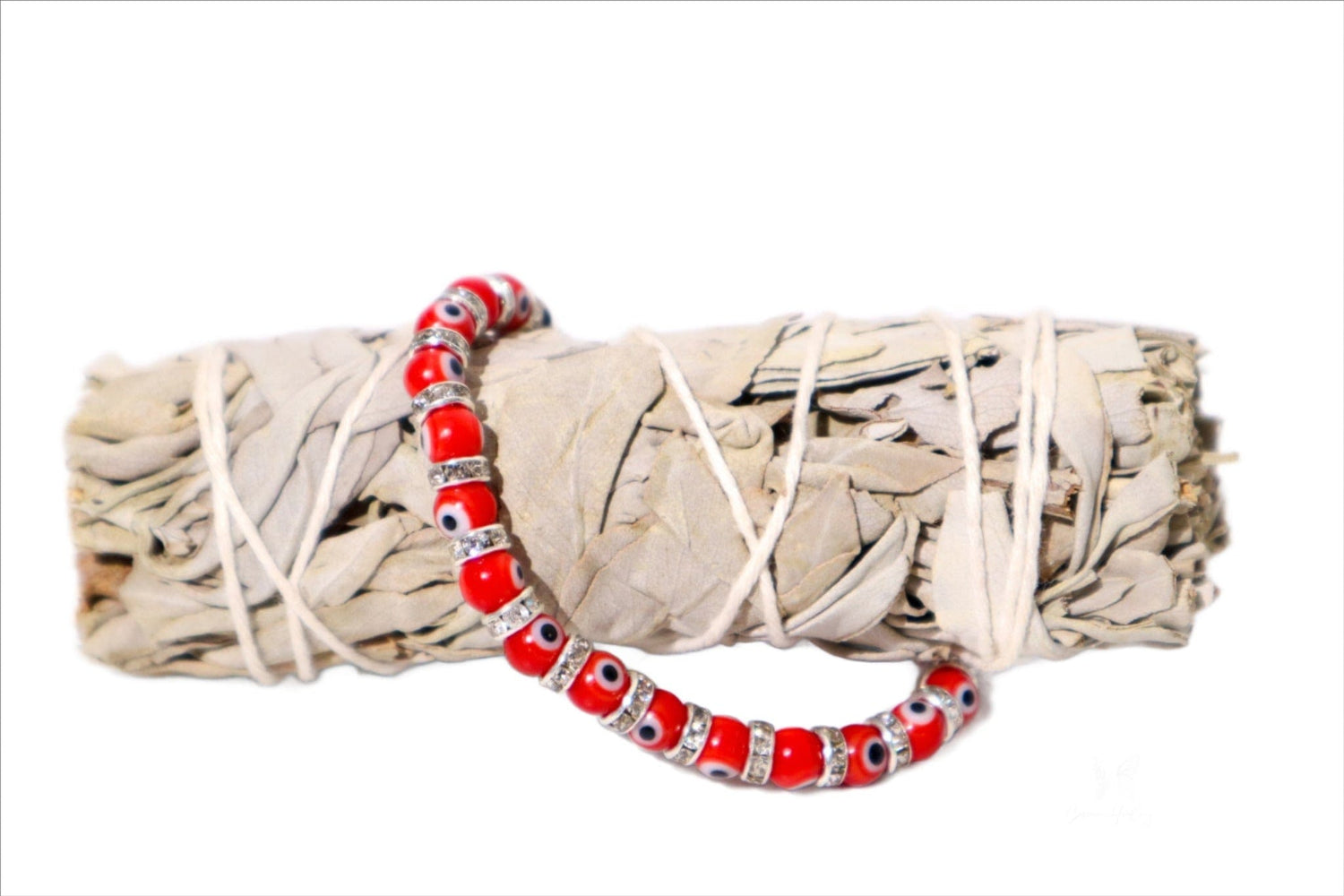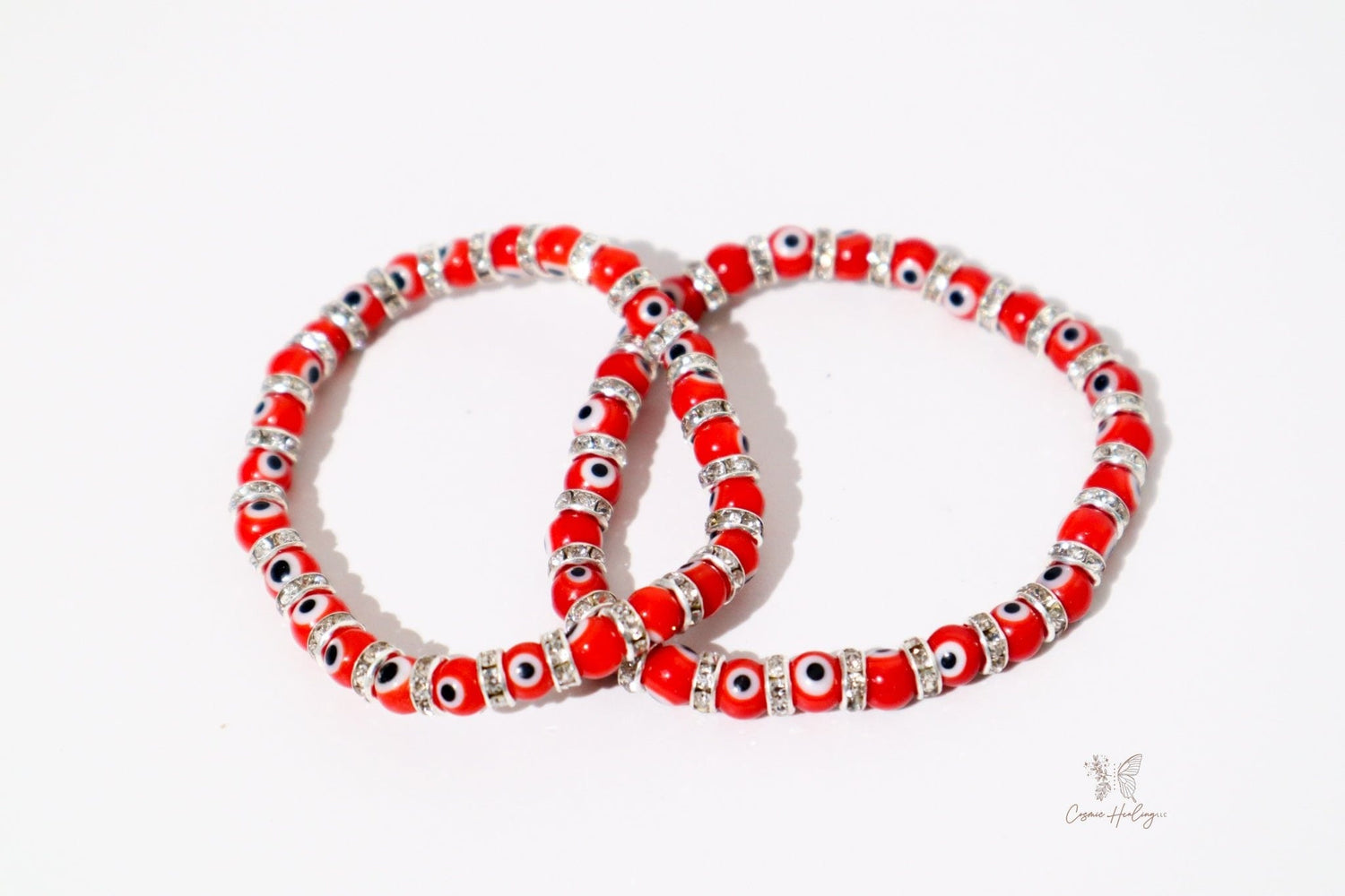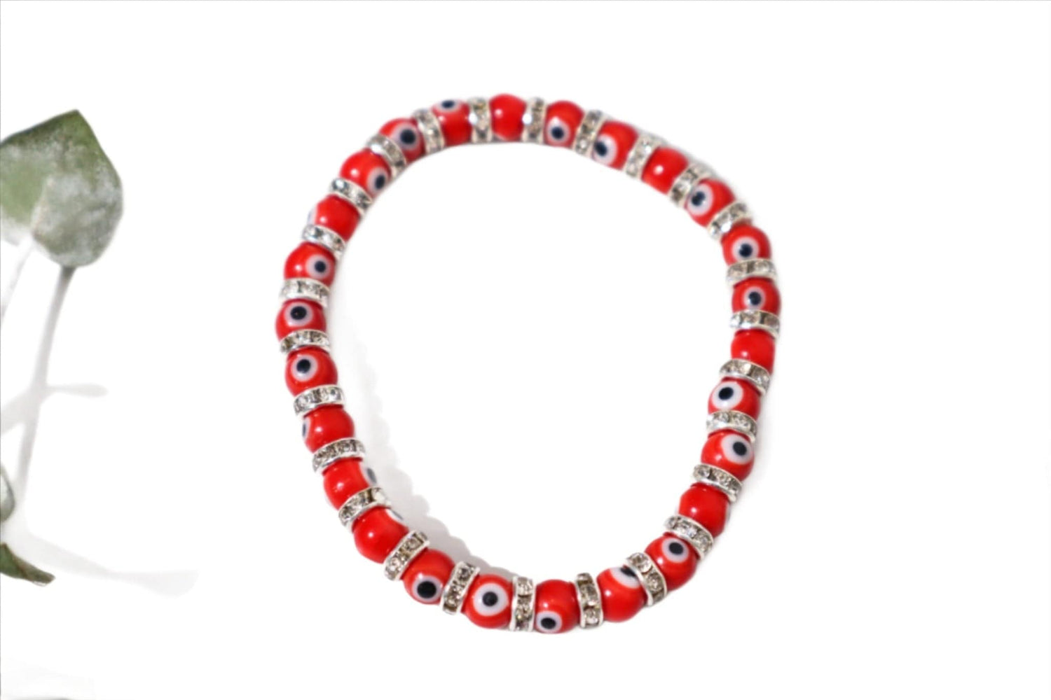 Evil Eye Charm Bracelet composed of Glass Beads and 6mm Rhinestones on an elastic tie. They are believed to help ward off the evil eye, provide protection from harm, and keep negative people away! With these, you are guaranteed to stay safe no matter what!