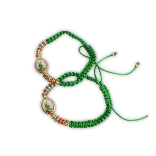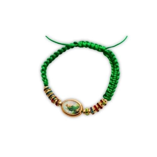 Green Saint Jude Thaddeus Nylon Thread Bracelet. Made with a simple green thread, this bracelet features a charm of Saint Jude Thaddeus, known for his association with hope in tough times. The colorful rhinestones add a splash of vibrancy, giving the piece a lively touch.