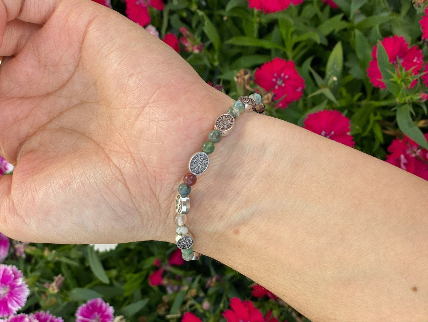 This stunning piece features exquisite Indian agate stones 4mm  known for their unique patterns and soothing energies, beautifully interspersed with a Saint Benedict medal. The bracelet is crafted with an elastic tie, ensuring a comfortable fit for wrist sizes between 17cm and 19cm. With its delicate design and the natural beauty of agate, this bracelet is perfect for adding a touch of elegance to any outfit while providing the wearer with spiritual grounding and harmony.