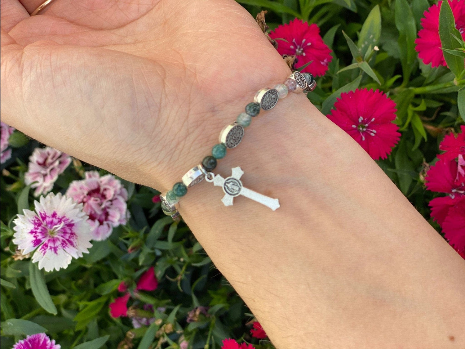 Indian Agate Gemstone Saint Benedict Rosary Bracelet