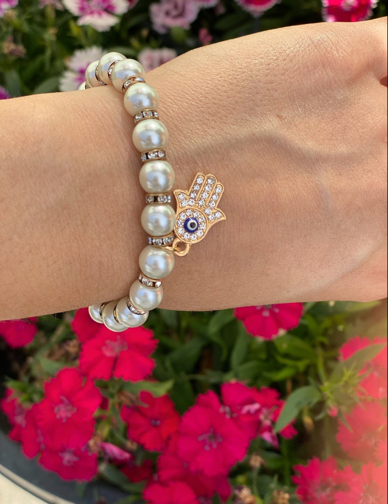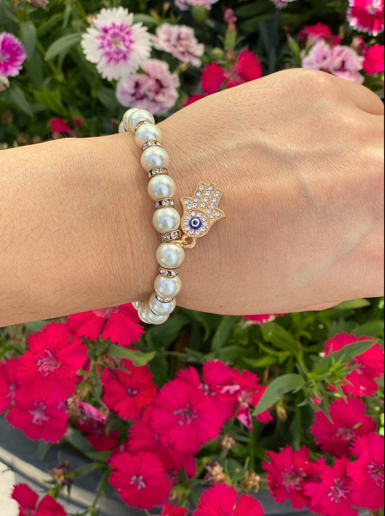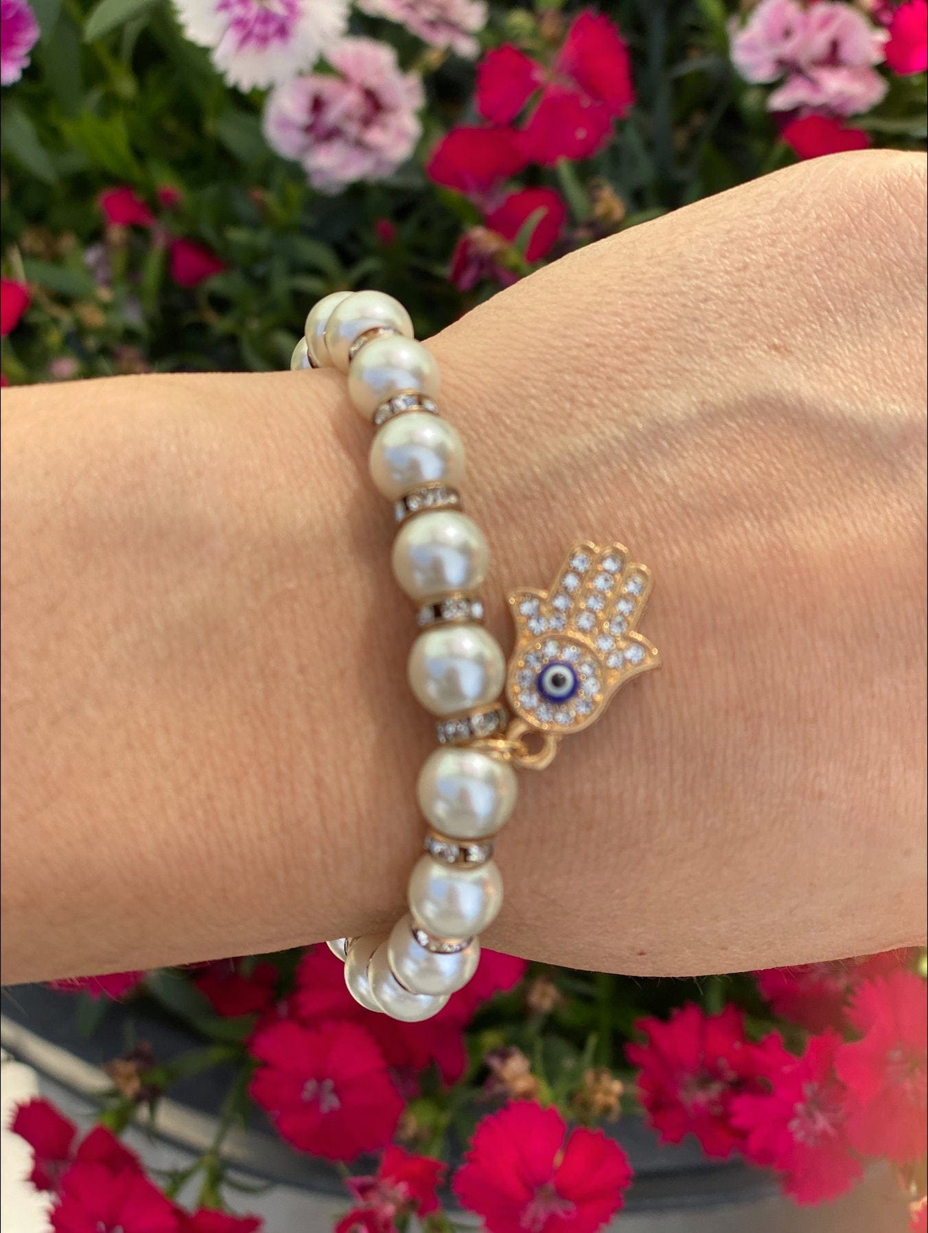 Handmade white pearl stretch bracelet with rhinestones and silver hamsa hand pendant. In energy work, this bracelet can become a talisman and charged with energies that are to protect the wearer. It is believed that the left side of the body is the receiving side, so wearing it on the left side allows the receiving of good fortunes and luck to come to you.
