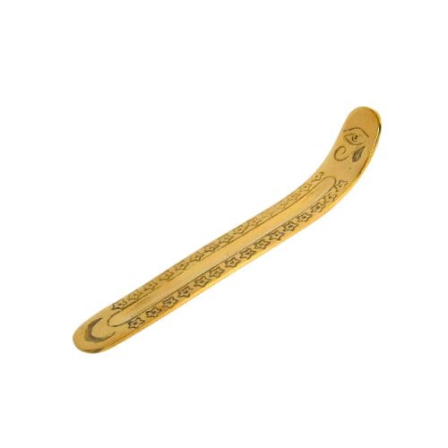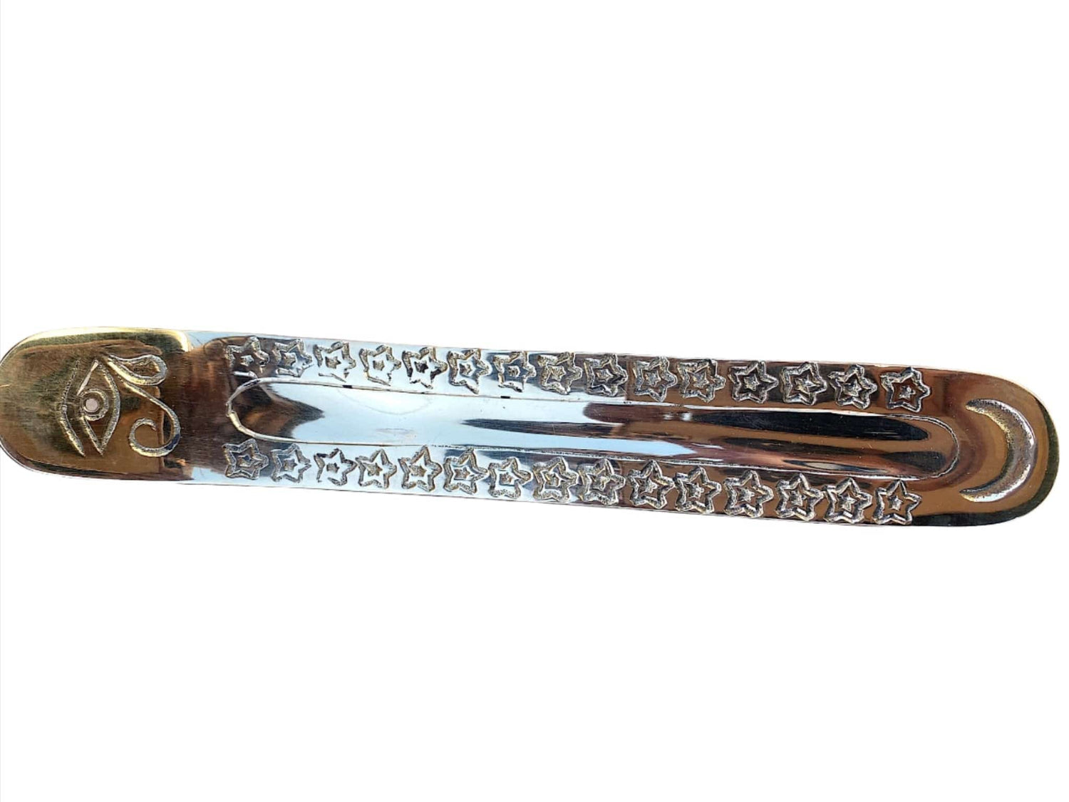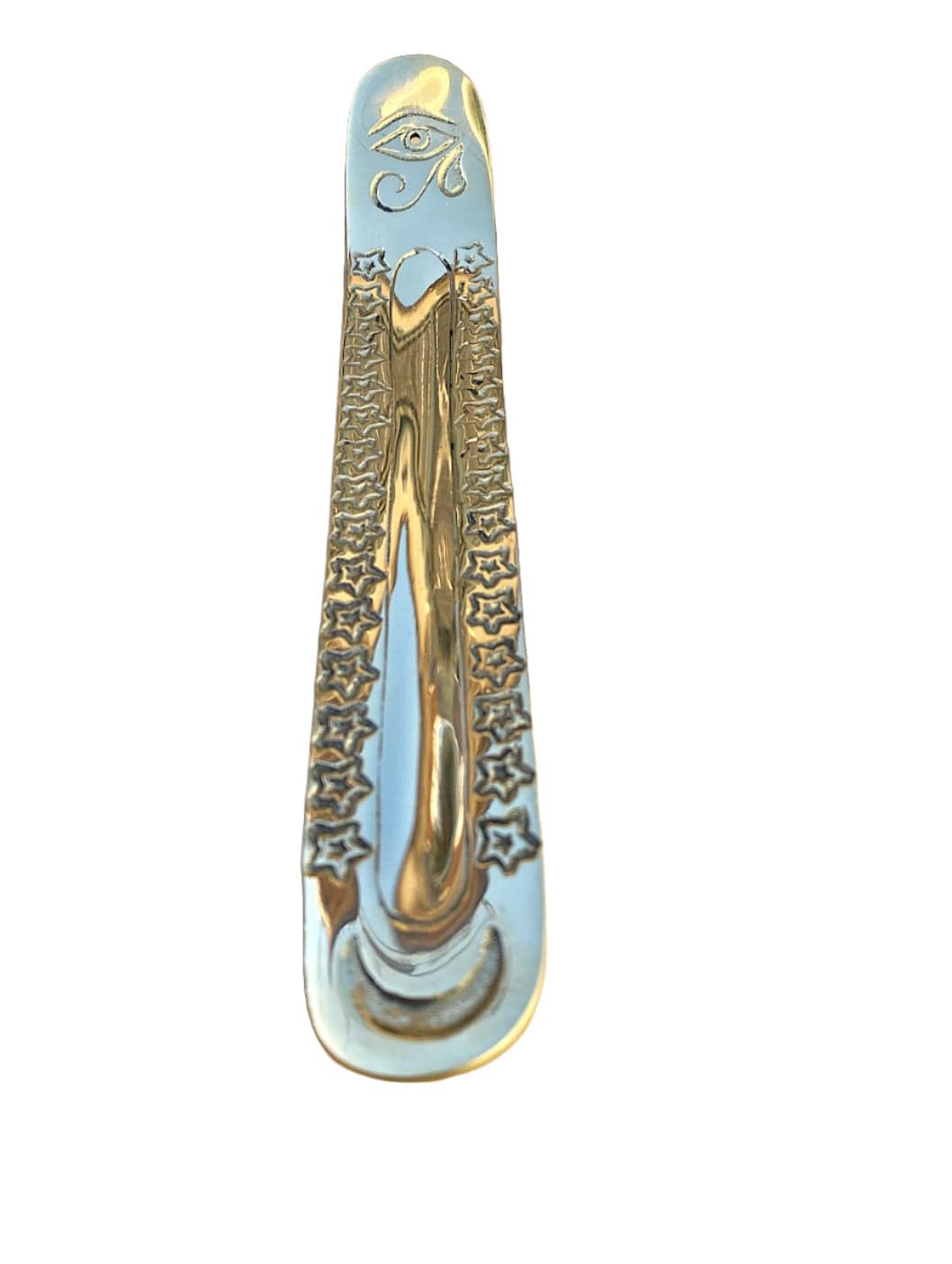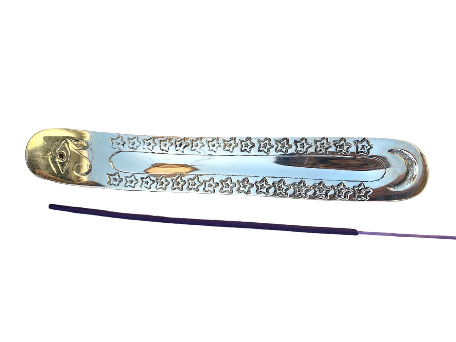 This incense burner is made of solid brass with a moon and star carved motif leading up to the Eye of Horus.