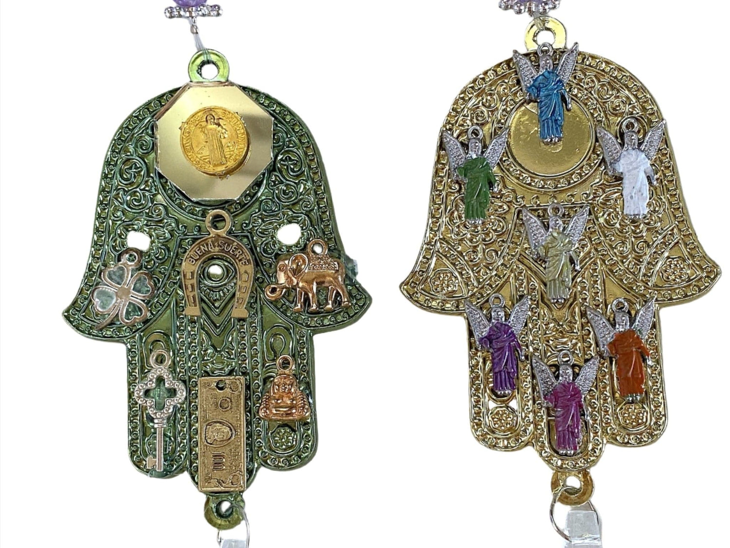 This amulet is adorned with various powerful spiritual charms that represent spiritual protection and good fortune including: horse shoe, dollar bill, skeleton key, elephant, cross, four leaf clover, mirror, Saint Benedict medal.