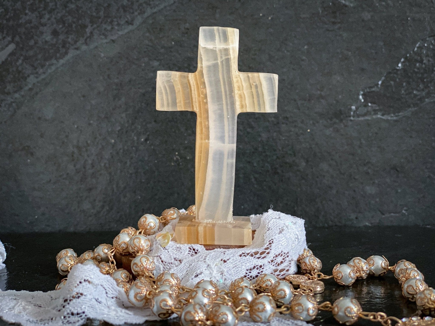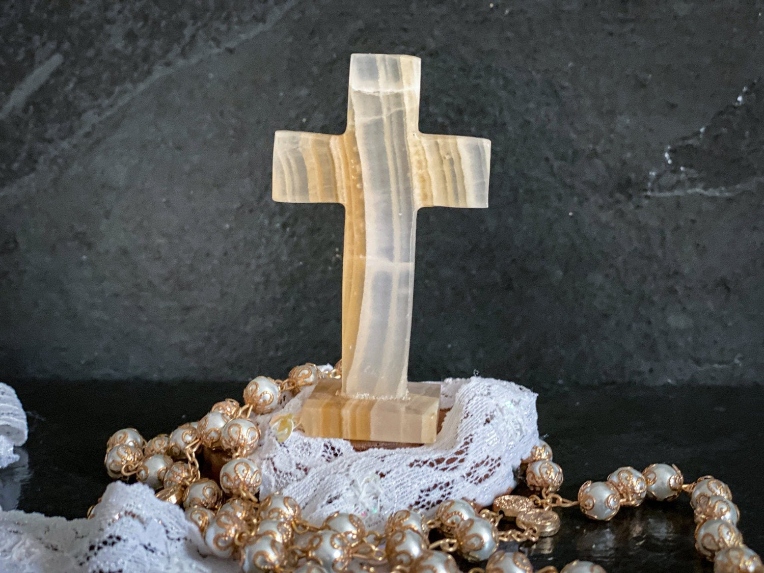 Yellow Banded Mexican Onyx Crystal 3" Cross with Base