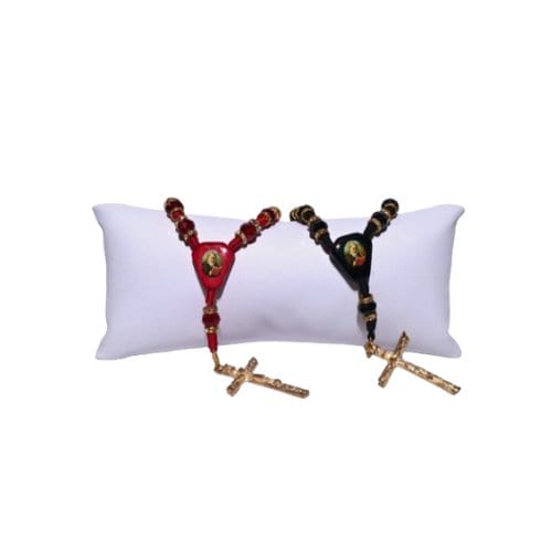 This gorgeous Saint Benedict Adjustable Auto Rosary is handmade from Mexico made of red nylon thread with Gold plated crucifix. It is adjustable with a toggle back and features a clasp which crucifix which can be changed. It can fit a small child to adult or use to hang over your rearview mirror to bring blessing to the wearer or the car in which it hangs. It measures 15 inches from the nape to the tip (measured while folded lengthwise).