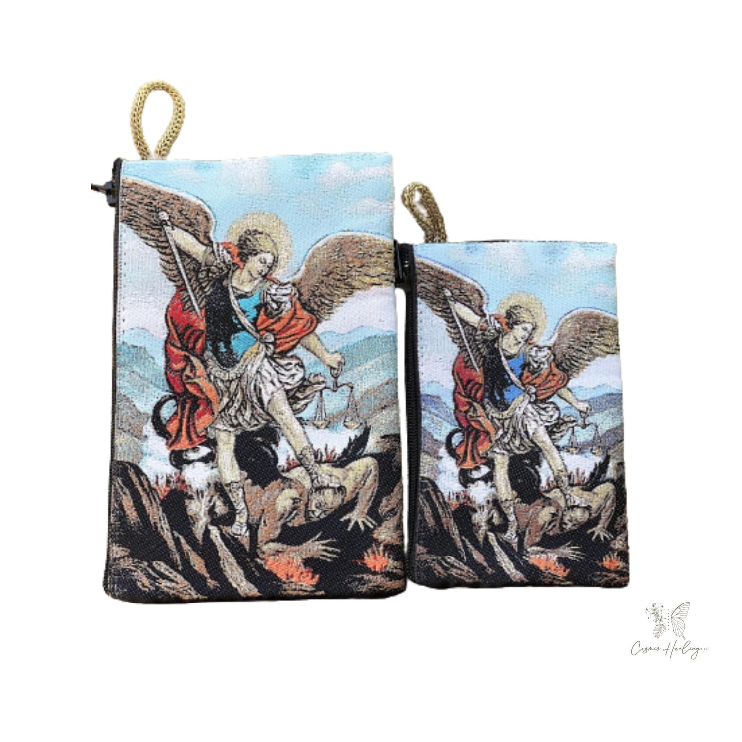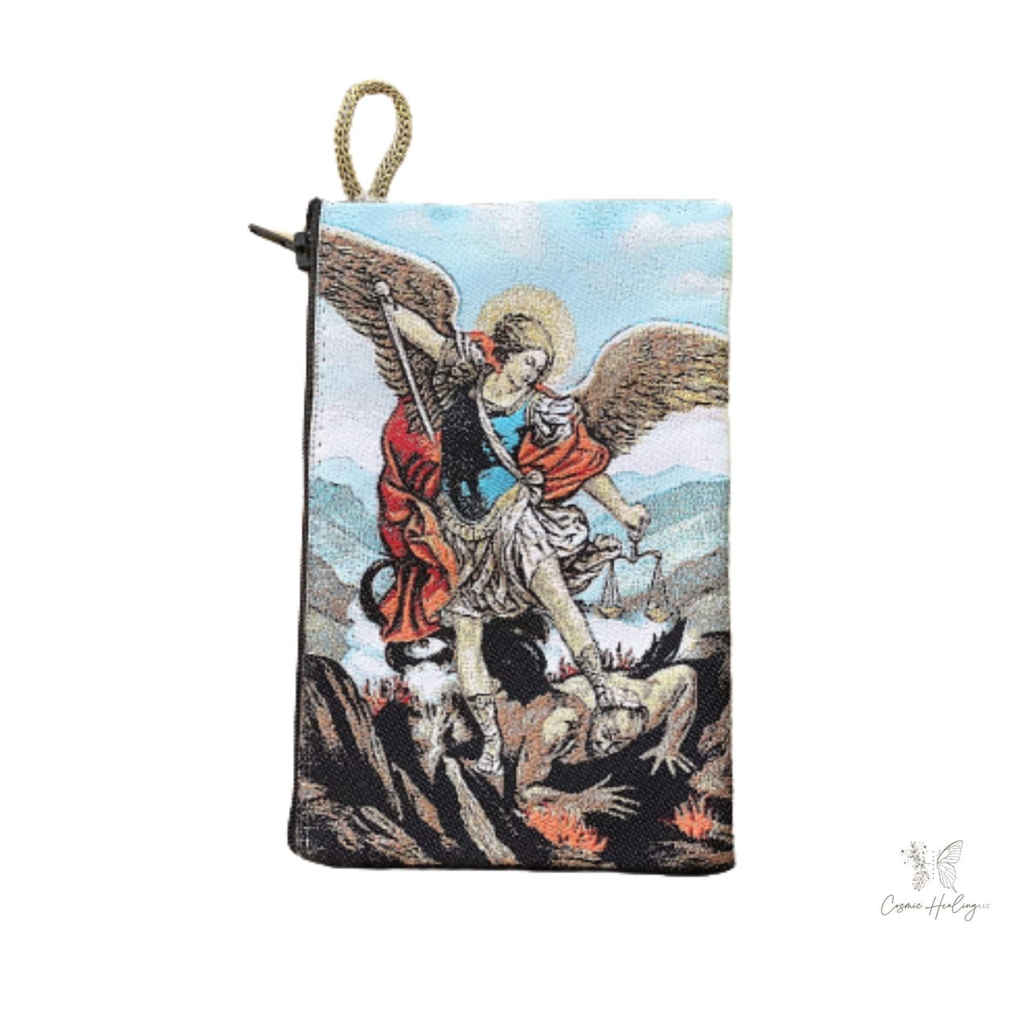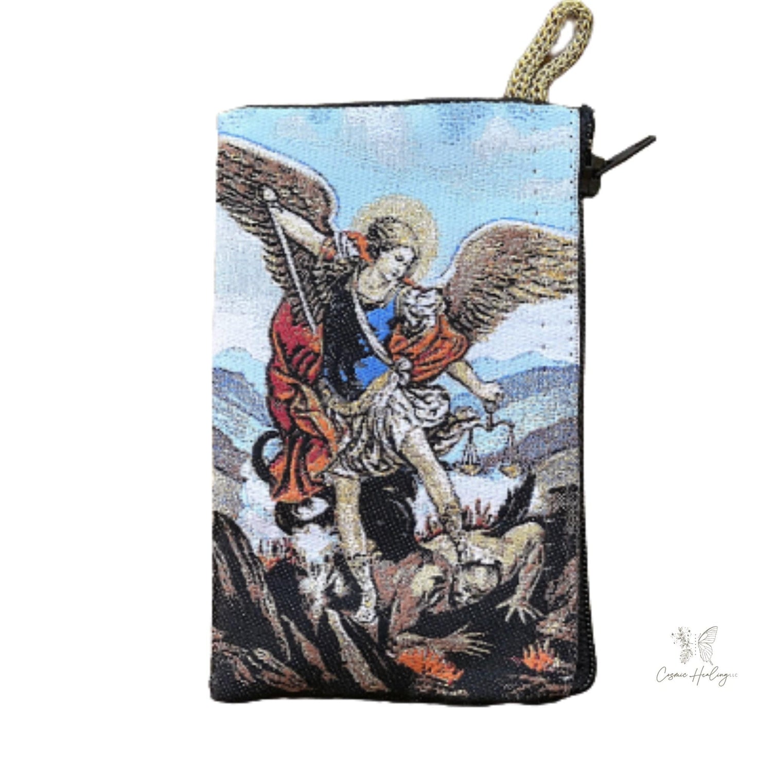 Esta bolsa de tapiz para rosario tiene una imagen increiblemente detallada de San Miguel Arcangel en battalla contra el mal.