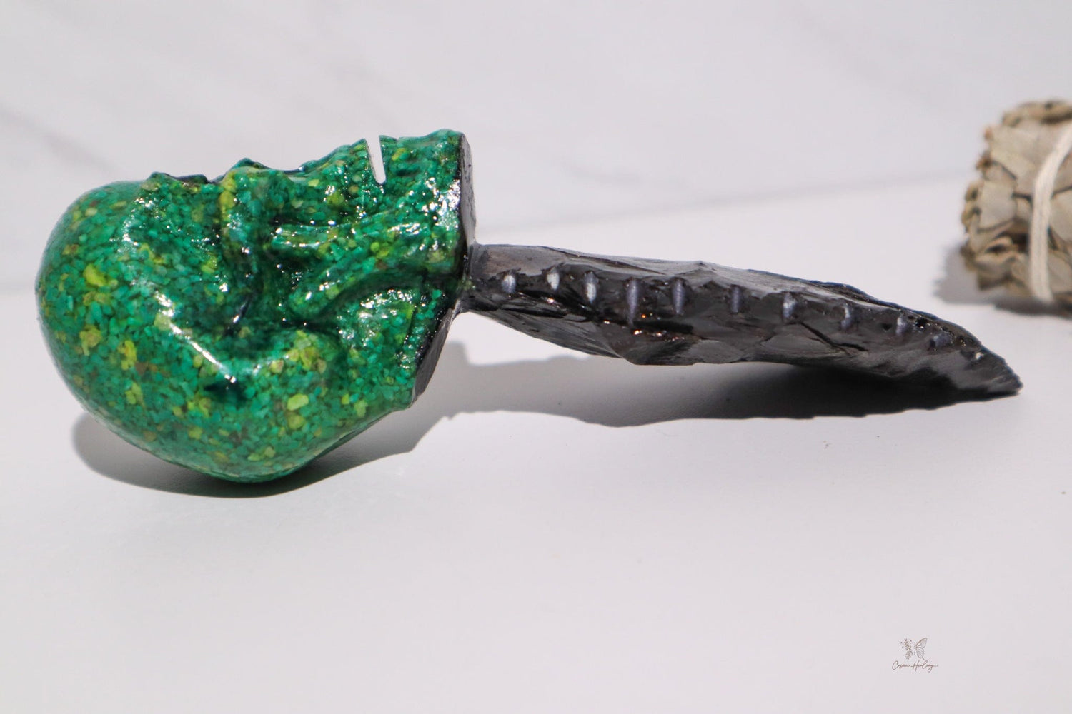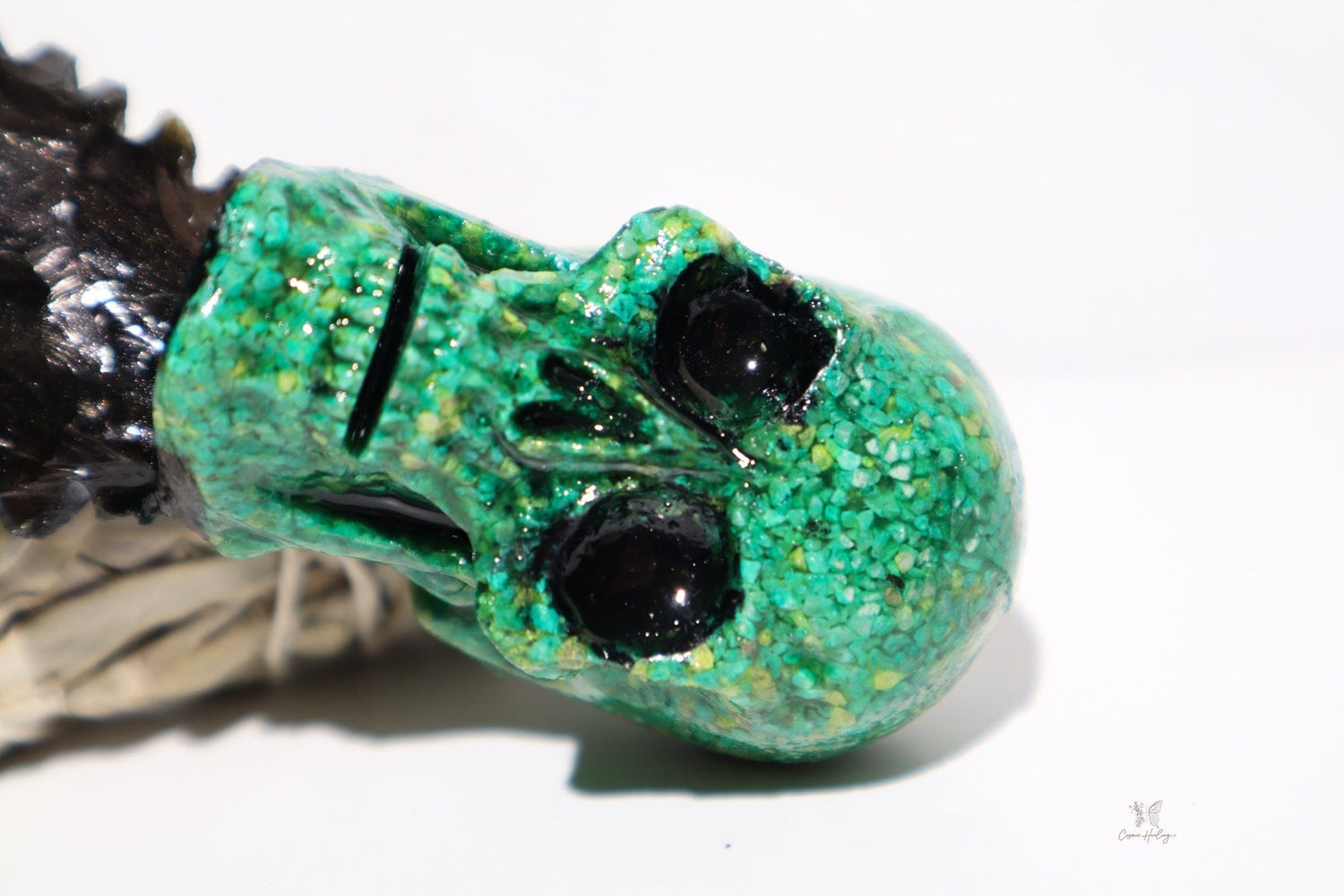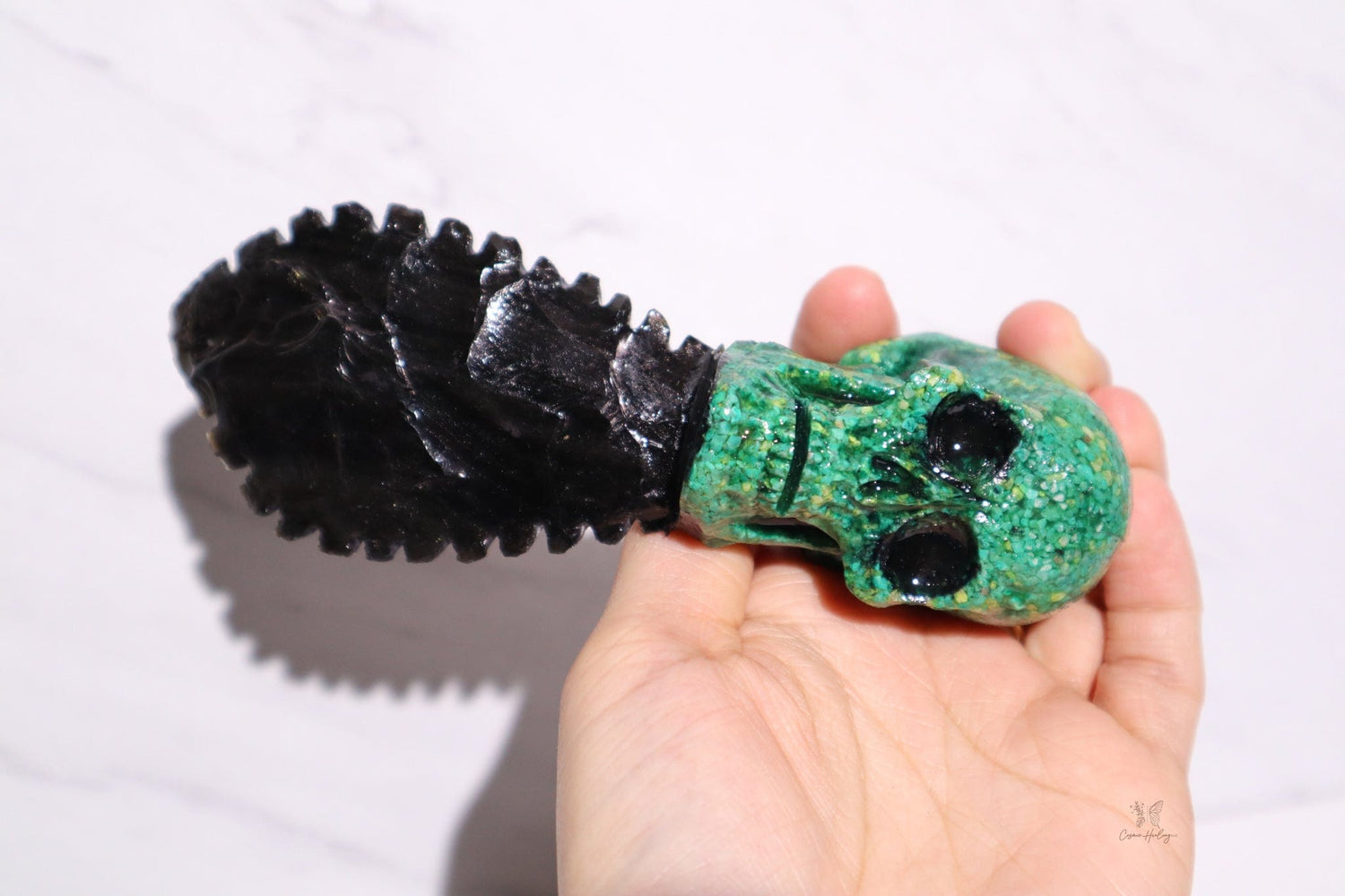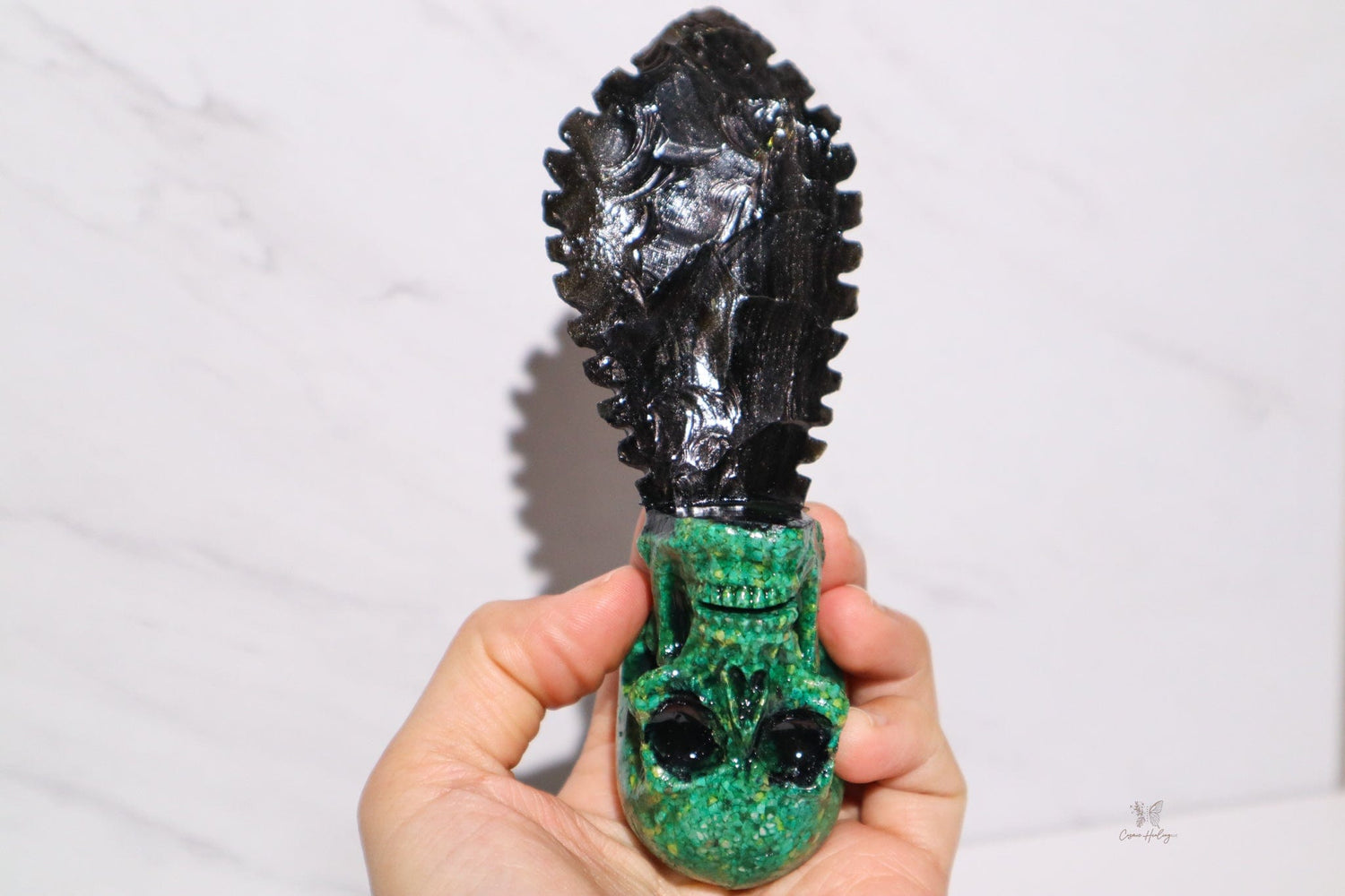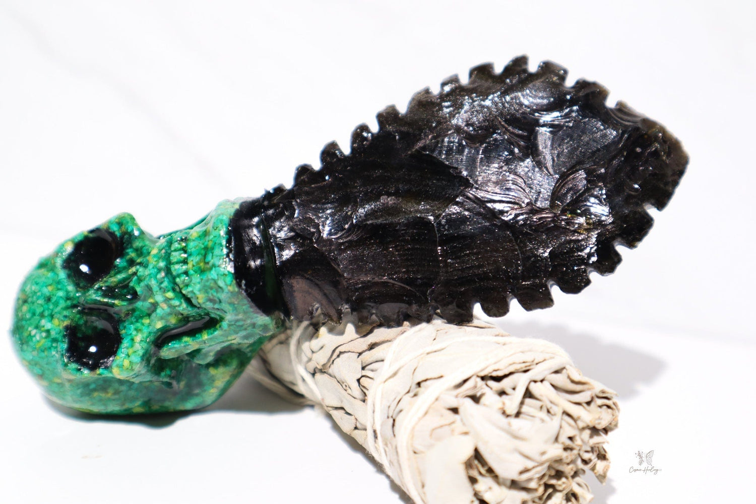 The Aztec Skull Dagger is unlike any other you've seen before. The Skull Dagger is a beautifully detailed knife made with a black obsidian blade and a hand casted handle from resin and sand. It features the Aztec Almanac at the top of the skull and flint knapped technique on the blade and is truly a work of art.