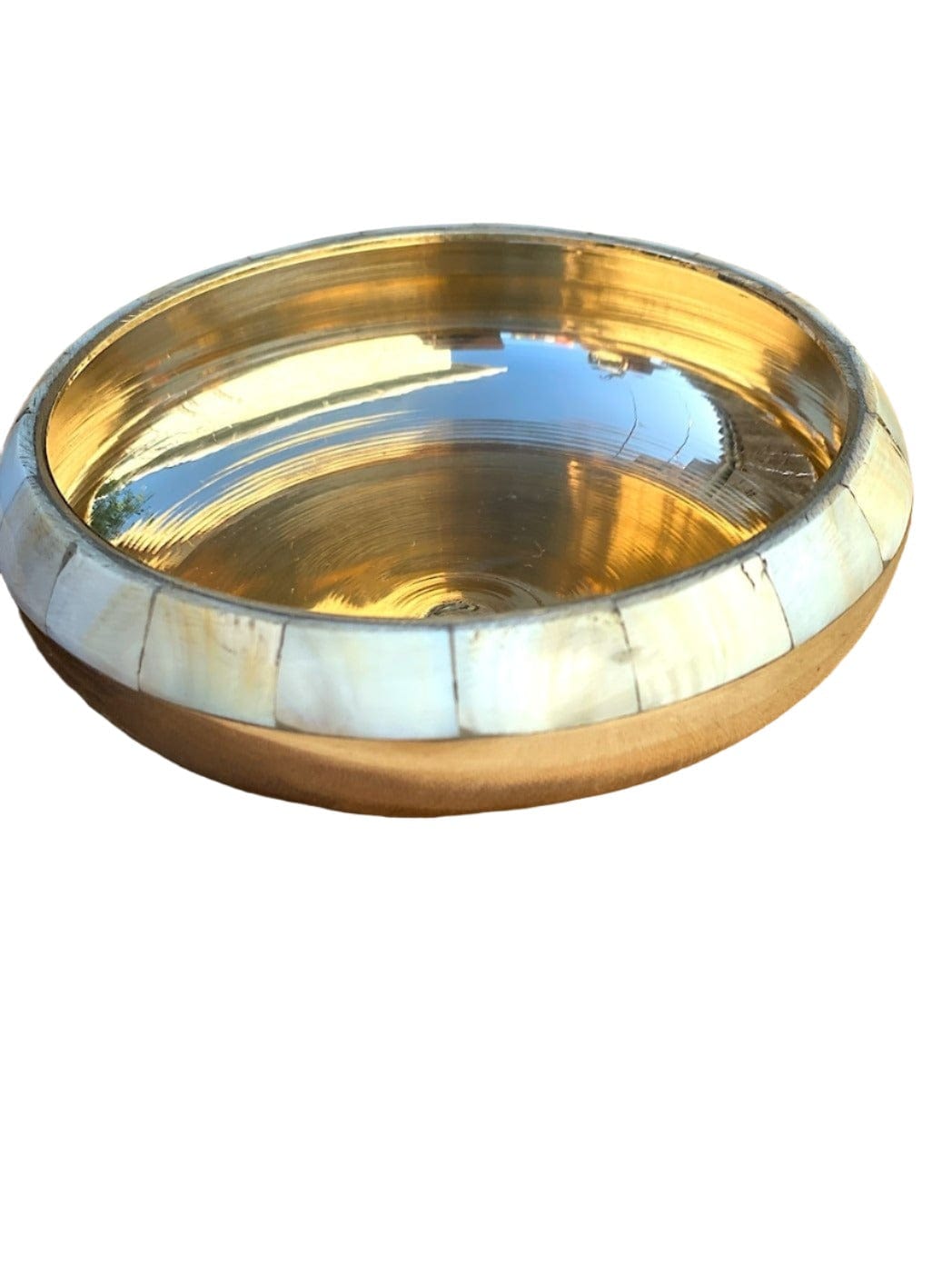 Temple shrine burner with mother of pearl inlay 4"diameter. This burner offers a great variety of combination of brass and pearl. Mother of Pearl is inlaid in squares around the bottom portion of the burner it offers a unique sense of design. Burn your favorite resin incense, cone incense or powder incense.