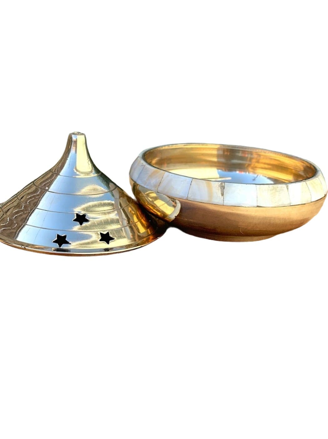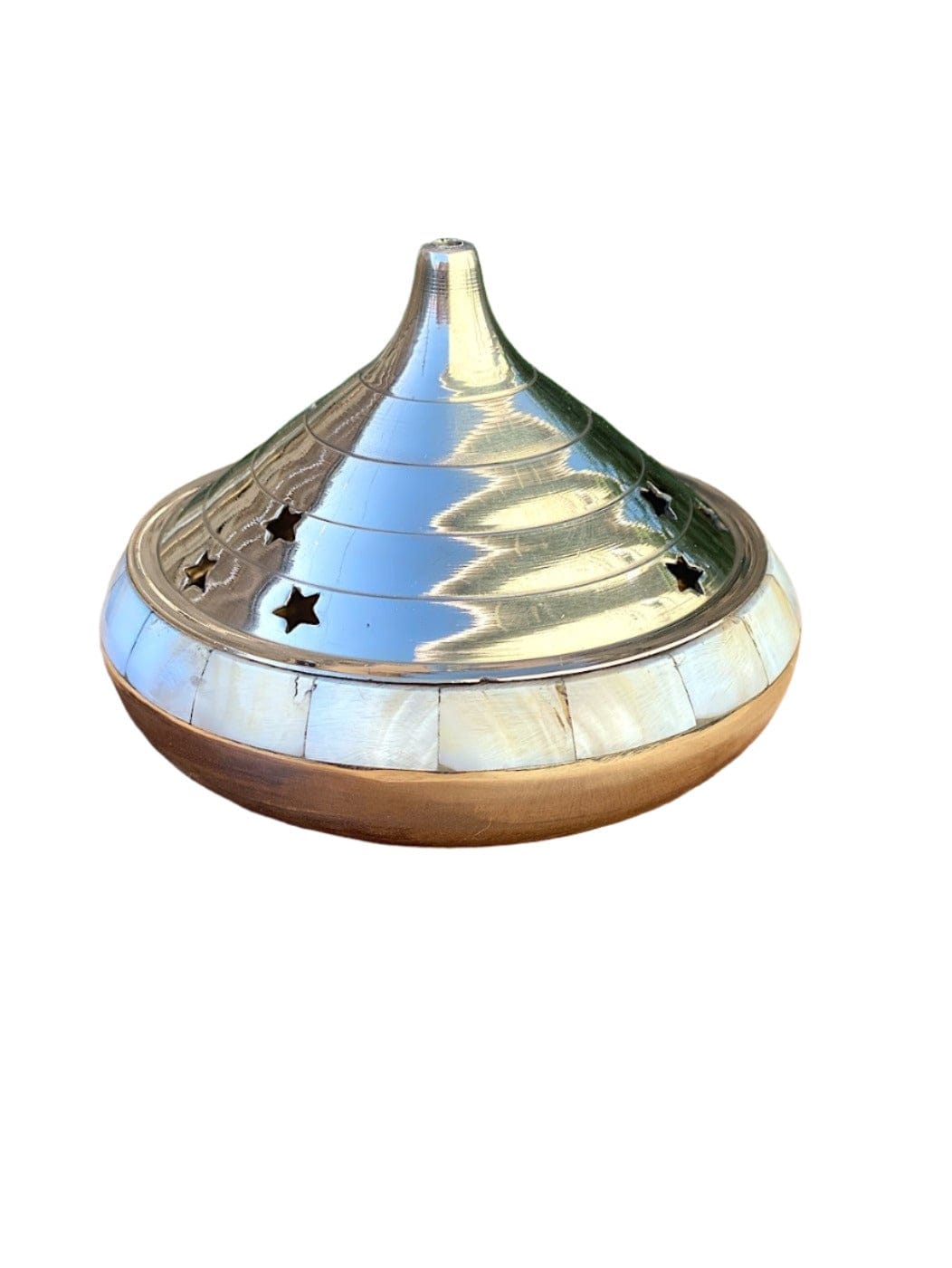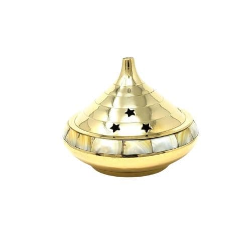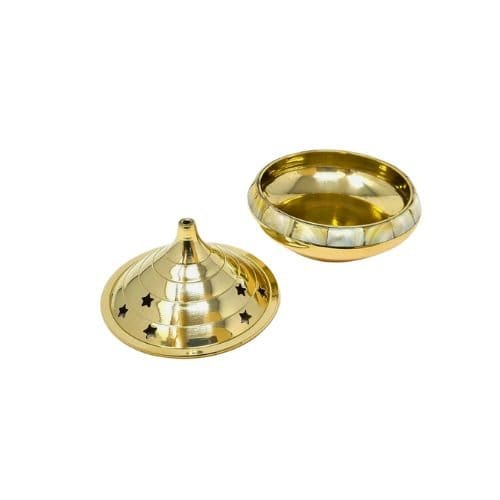 Este quemador ofrece una combinación única de latón y perla madre. La perla madre está incrustado en cuadros alrededor de la parte inferior del quemador, brindando un diseño exclusivo. Quema tu incienso de resina, incienso en cono o incienso en polvo favorito.
