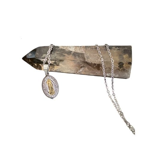 This gorgeous stainless steel pendant features a gold monogrammed Virgen de Guadalupe image with reversible images for both gold and silver choices. This oval pendant is 2cm on silver plated chain. An elegant dainty feel, perfect for everyday wear.