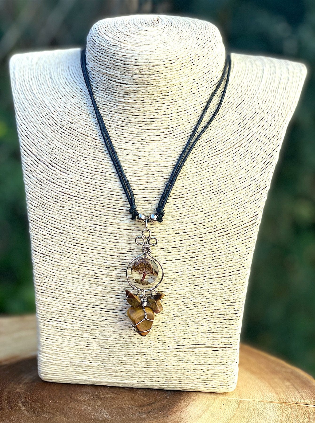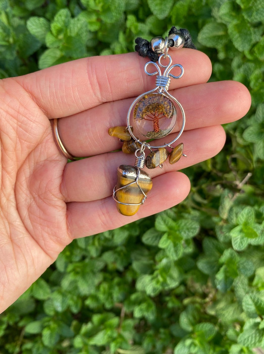 - Pendant: Hand-wrapped Tiger’s Eye crystal encased in a brass Tree of Life pendant