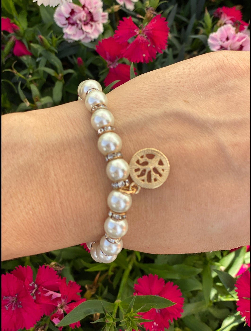 This delicate pearl bracelet a beautiful filigree Tree of Life charm adorned with Rhinestones In energy work, this bracelet can become a talisman and charged with energies that are to protect the wearer.