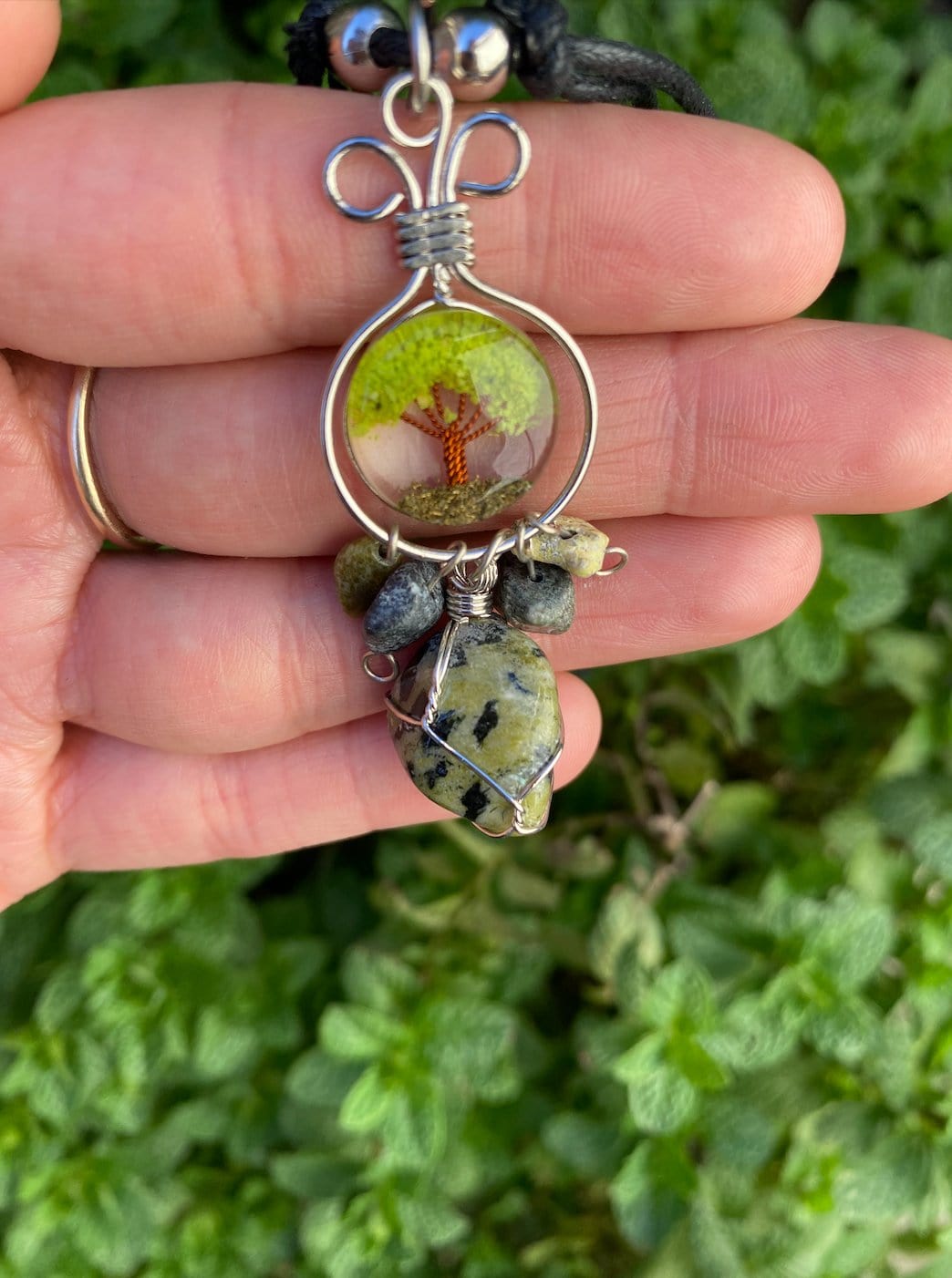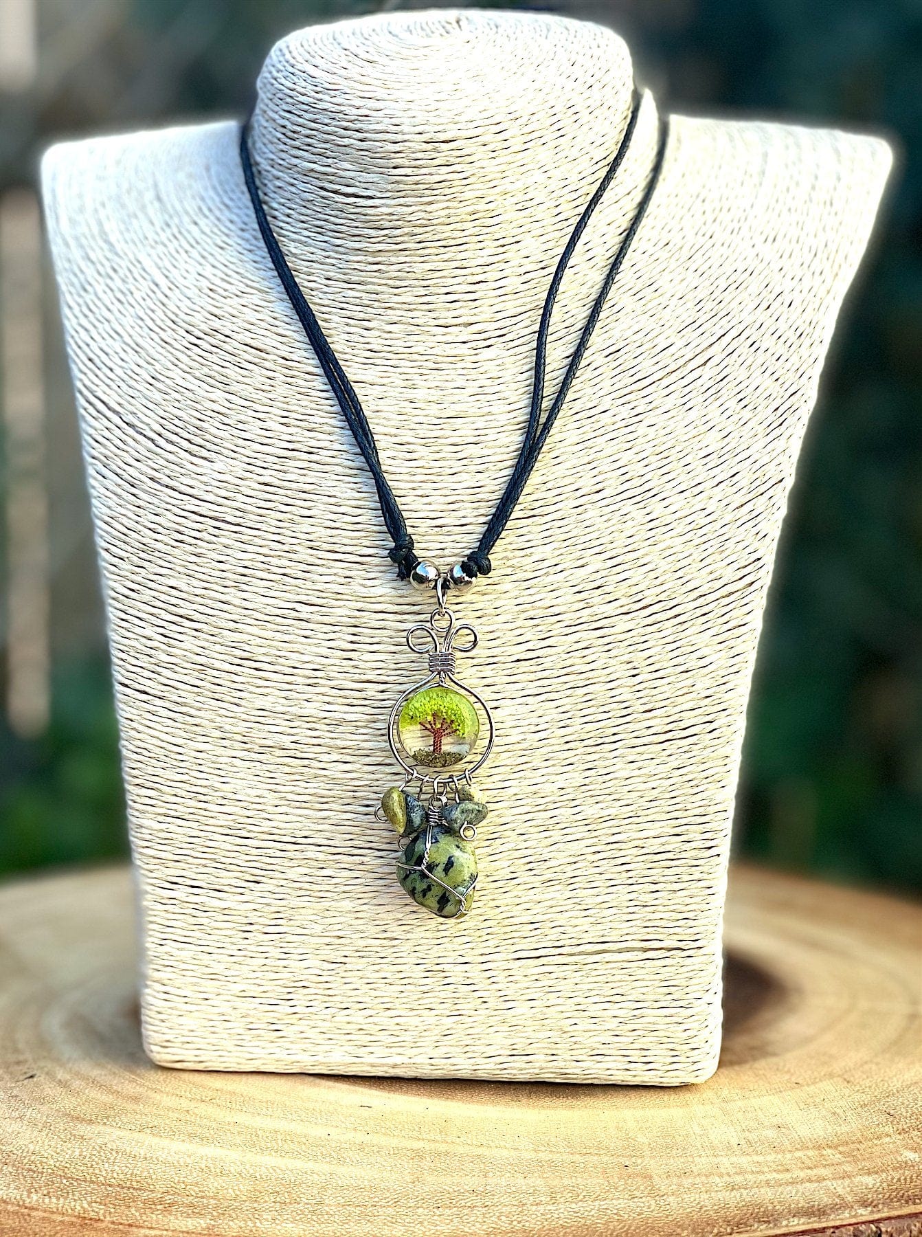 Wear a piece of nature close to your heart. Tree of Life Necklace includes beautiful encapsulated brass pendants in the shape of a tree, with polished Serpentine hand wire wrapped crystal pendants.