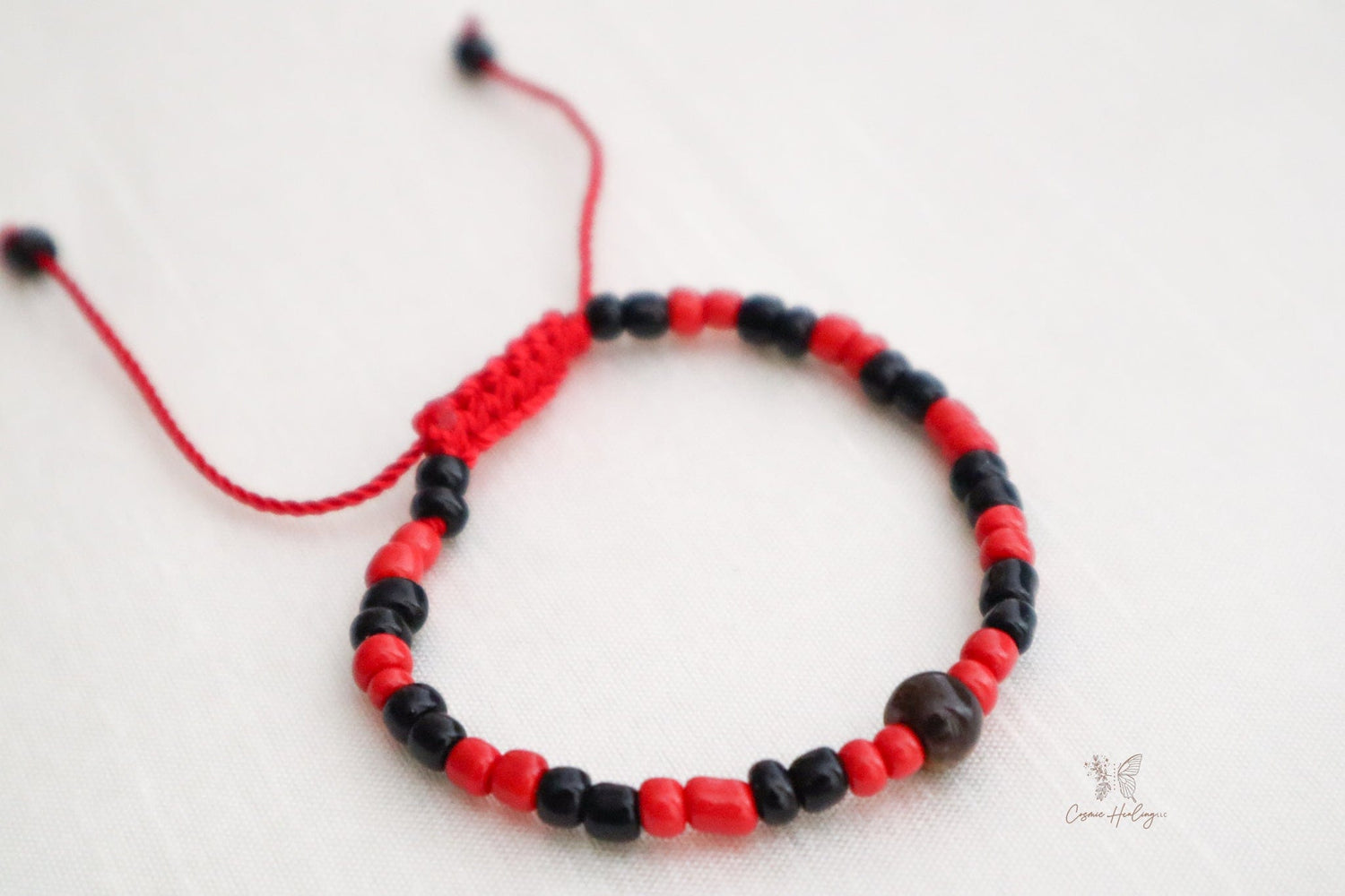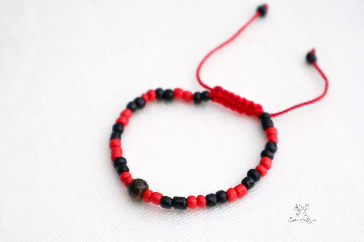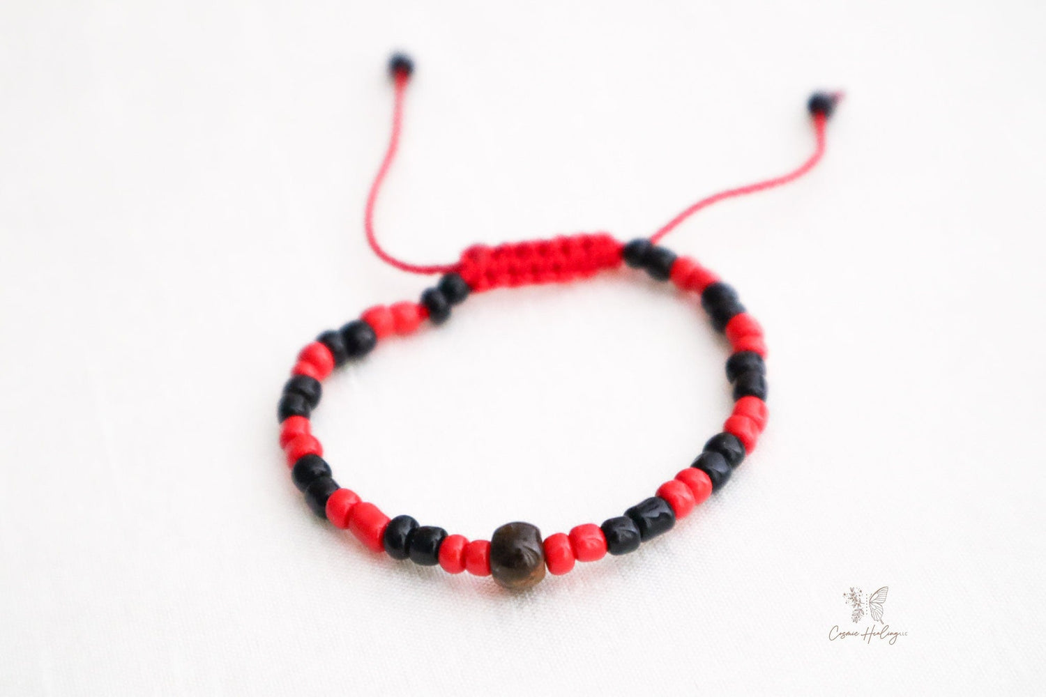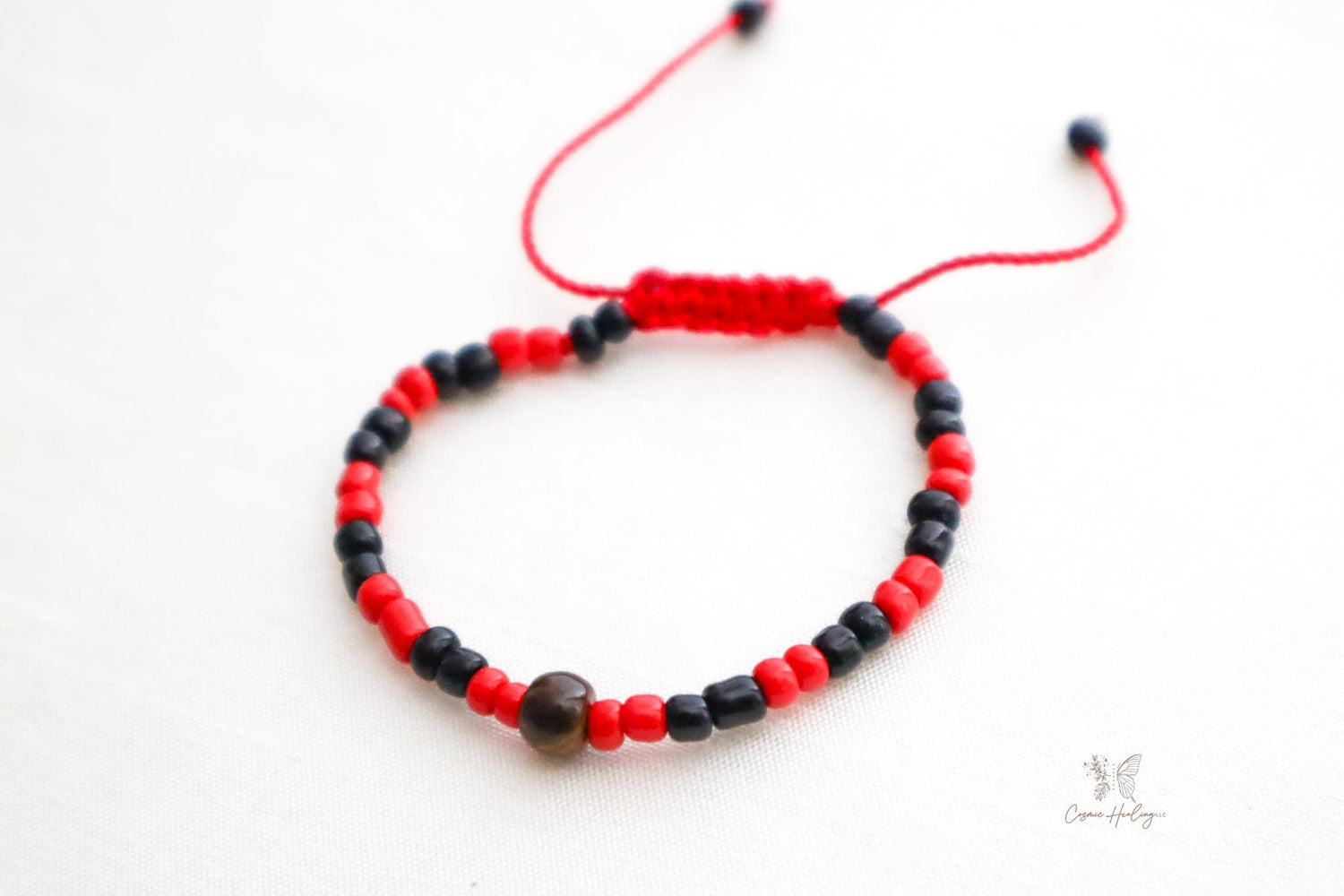 Tiger's eye is said to be a symbol of protection from the evil eye and good luck. The red thread is a symbol of protection against the evil eye.