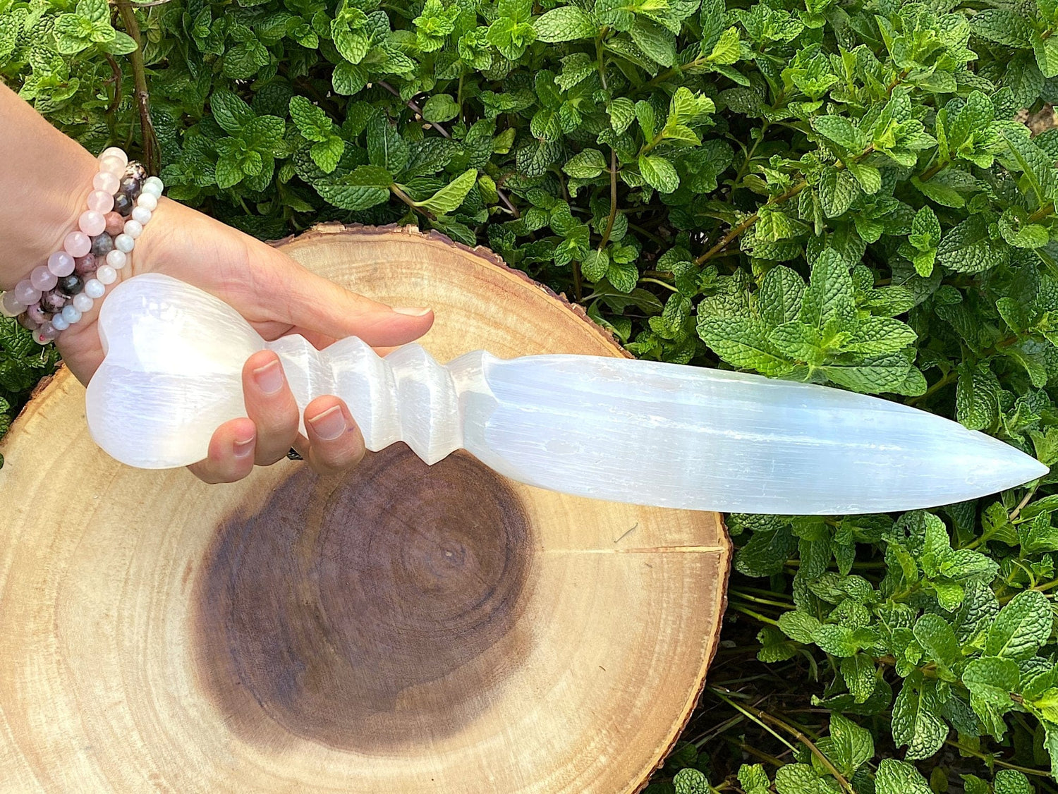 Recita un mantra y sostén esta daga de selenita en tu mano para concentrar tu poder, o úsala para despejar el espacio en un ritual. Limpia tus pensamientos negativos y déjalos disiparse con rituales de limpieza al difuminar la Daga Selenita. Carga cristales poderosamente transfiriendo su energía con la daga de selenita o cúrate a ti mismo usándola como sustituto de tu cuerpo.