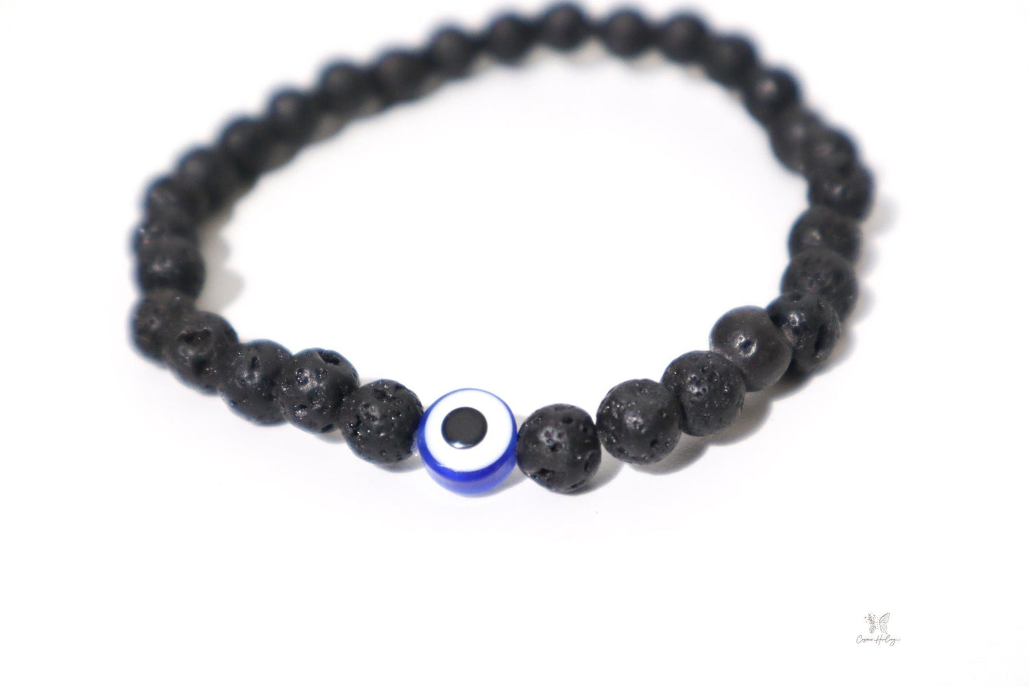 Piedra calmante, muy útil para disipar la ira. Promueve cambios positivos cuando sea necesario en cuestiones de comportamiento. La piedra de lava mejora la fertilidad. El regalo perfecto para alguien que amas. Estas pulseras de gemas de piedra de lava no solo son impresionantes, sino que también vienen con un Ojo Azul de Nazar, que se cree que repele el mal de ojo. También es el regalo perfecto para ti.