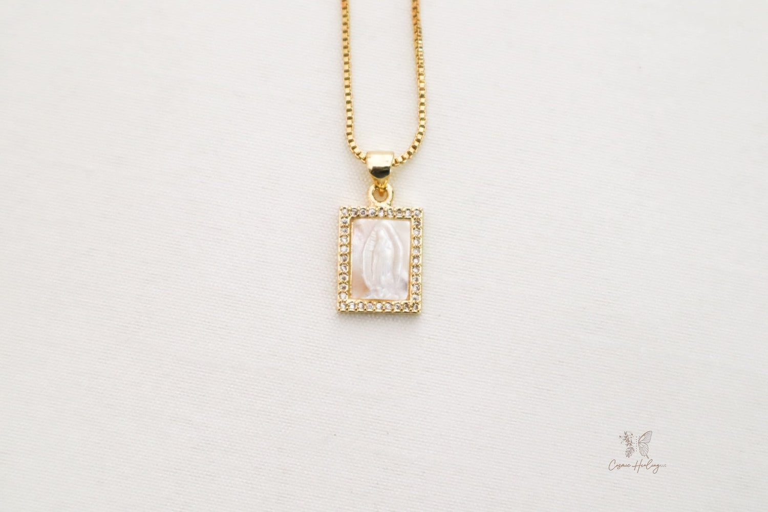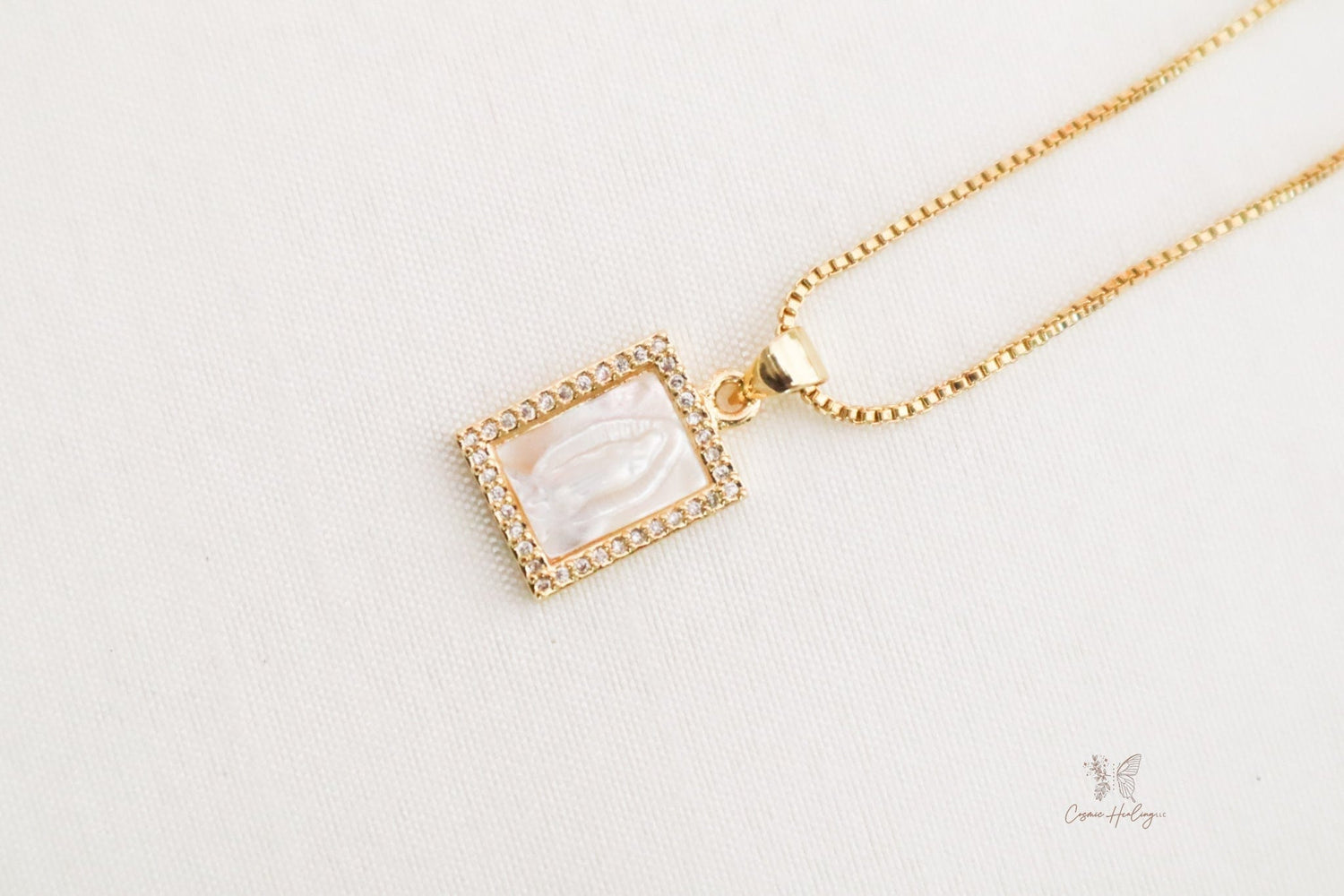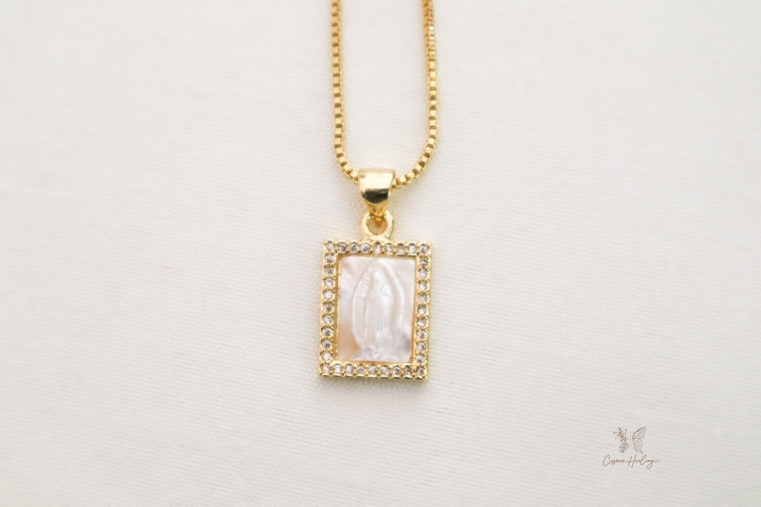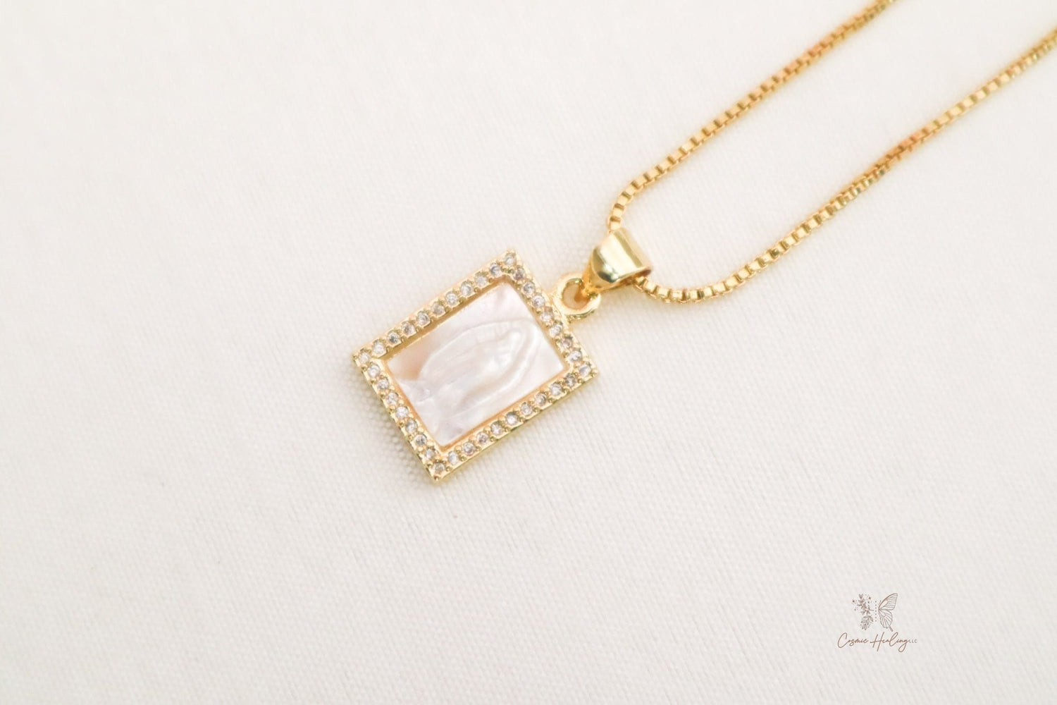 El accesorio perfecto para cualquier look, un collar de Nuestra Señora de Guadalupe presenta un colgante cuadrado de concha de perla adornado con un elegante y delicado monograma de la Virgen de Guadalupe. El regalo perfecto para usted o su ser querido, este elegante collar nunca pasará de moda.