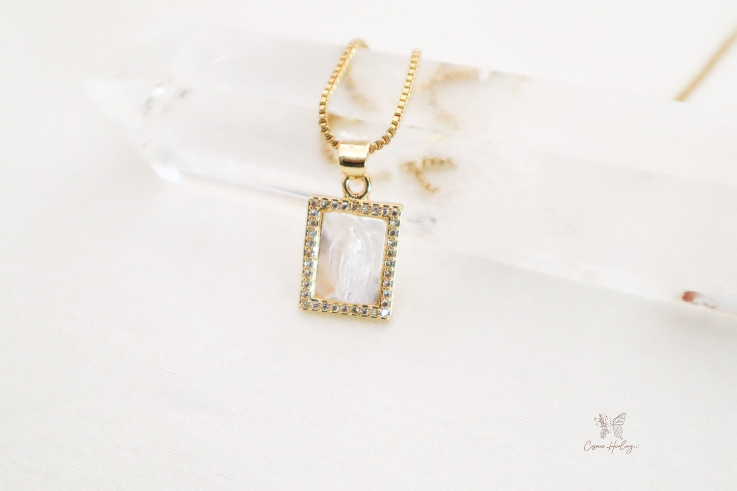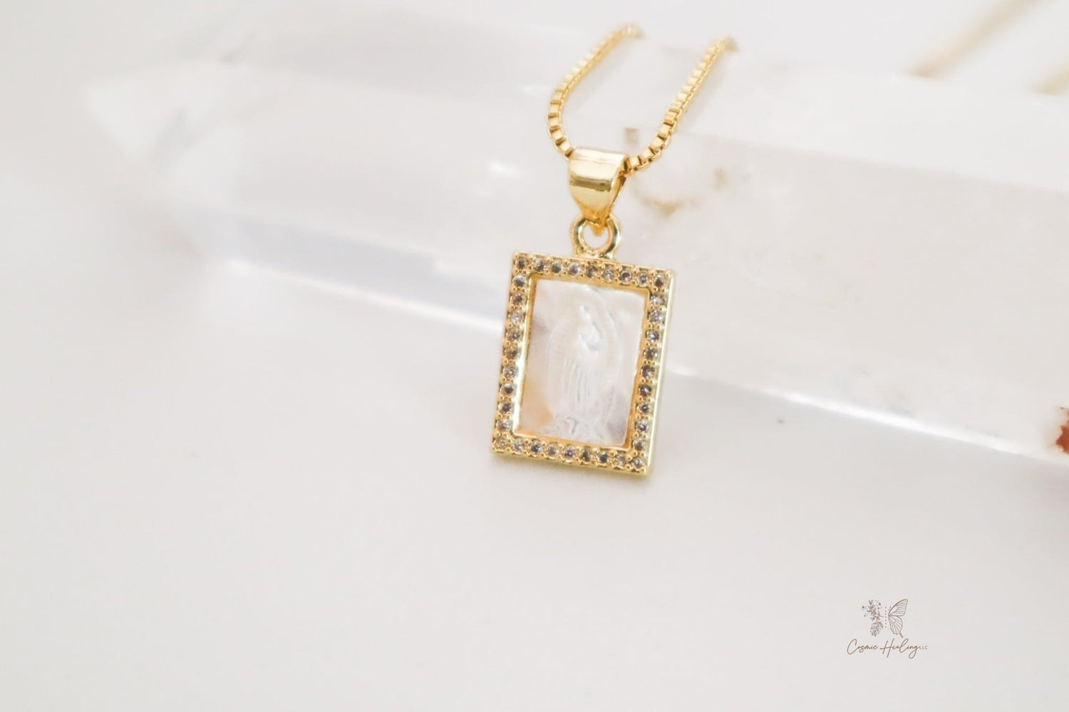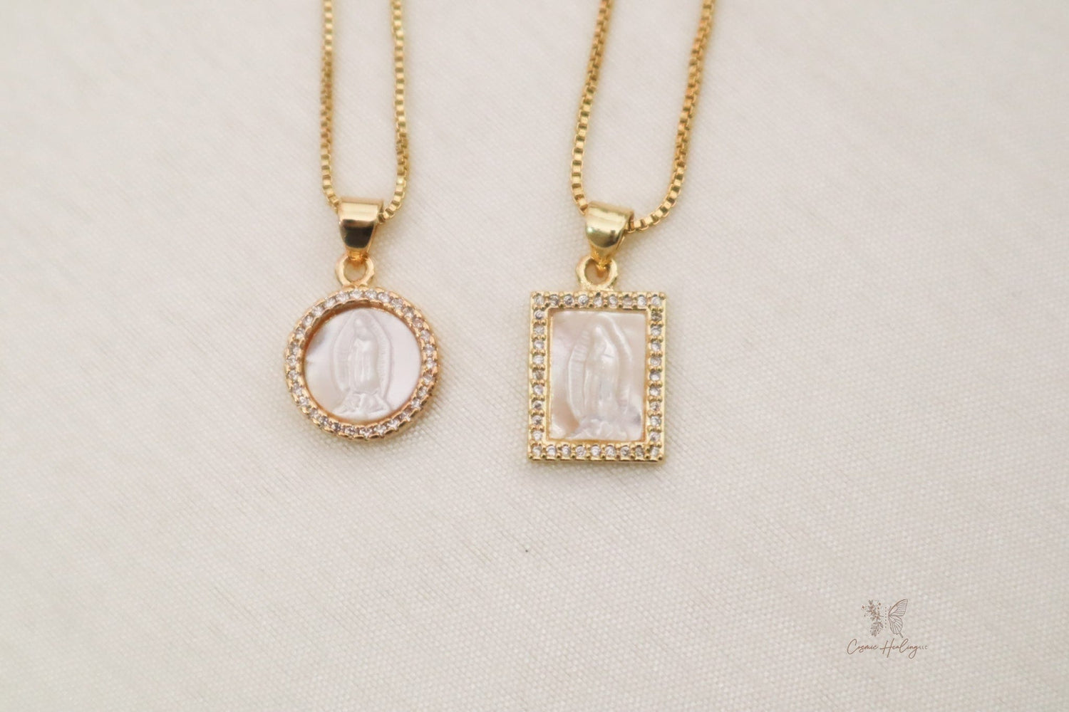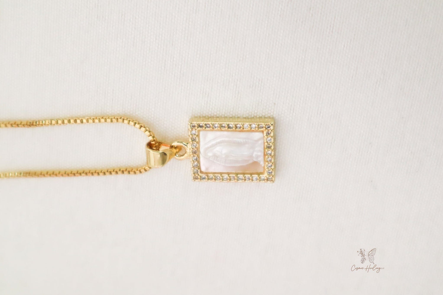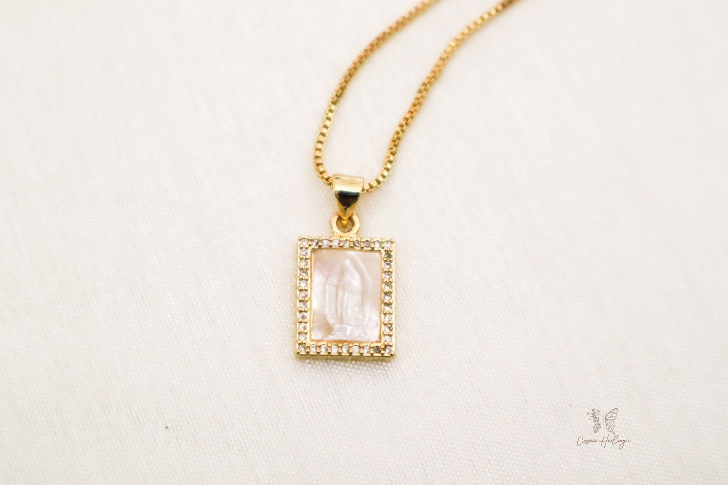 El accesorio perfecto para cualquier look, un collar de Nuestra Señora de Guadalupe presenta un colgante cuadrado de concha de perla adornado con un elegante y delicado monograma de la Virgen de Guadalupe. El regalo perfecto para usted o su ser querido, este elegante collar nunca pasará de moda.