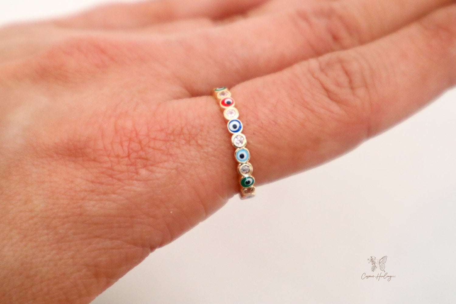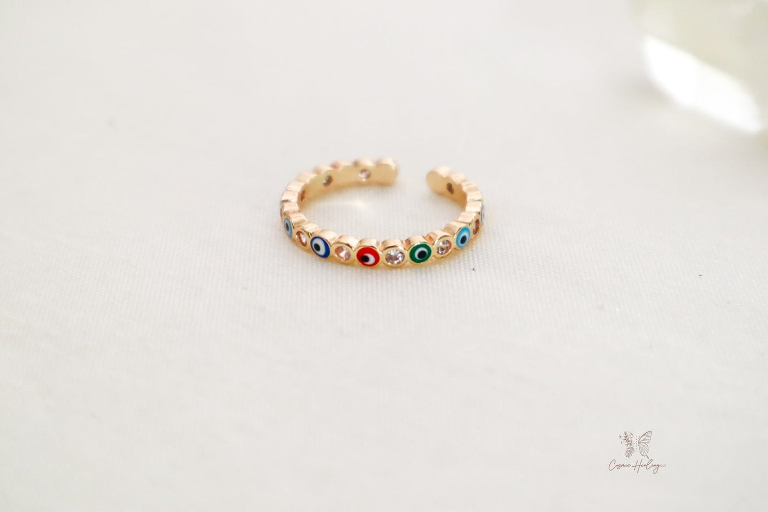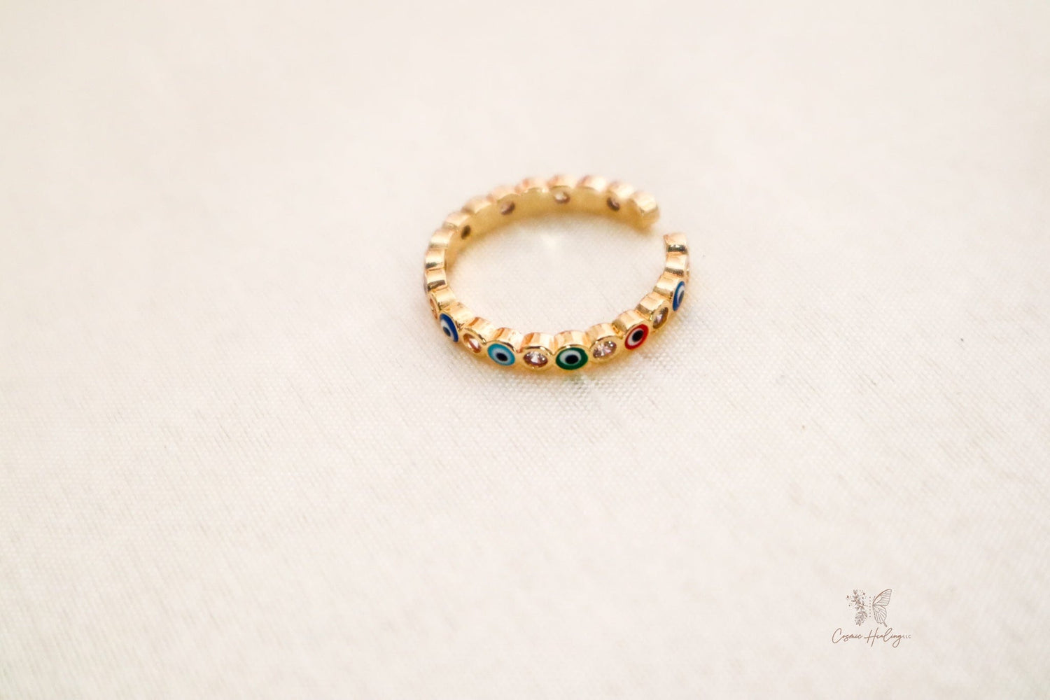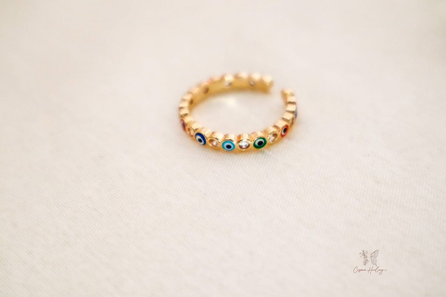 ¡El regalo perfecto para tu ser querido! Se dice que el mal de ojo es un símbolo muy poderoso y algunos lo consideran el amuleto más poderoso. Se cree que crea protección contra el "mal de ojo" o la "envidia de los demás". Este delicado anillo presenta un hermoso ojo multicolor con diamantes de imitación que nunca pasará desapercibido. ¡Lleva este anillo en tu dedo índice para lograr el máximo efecto!