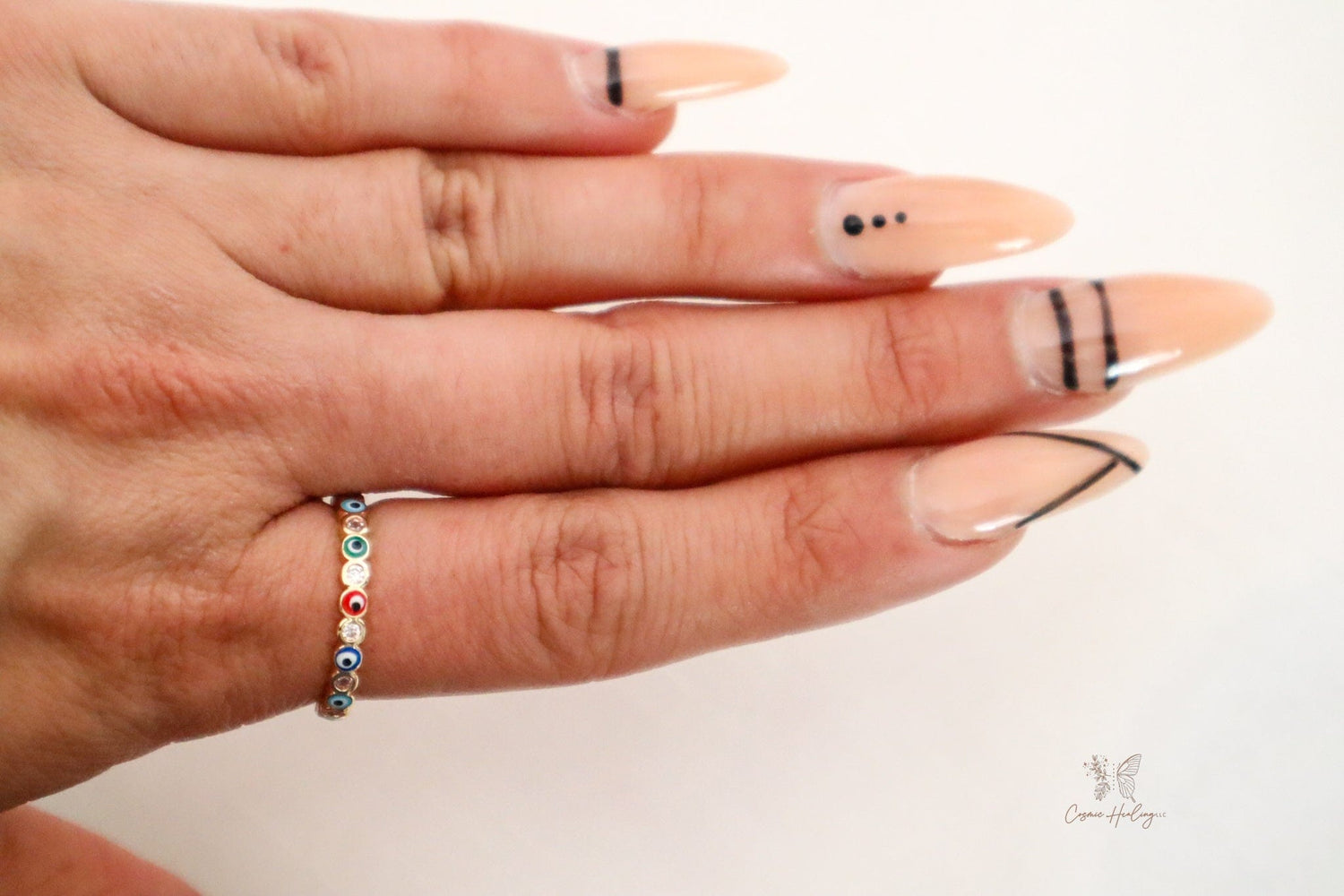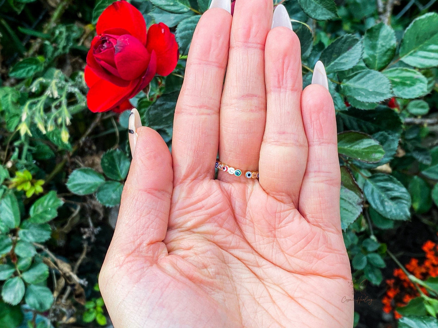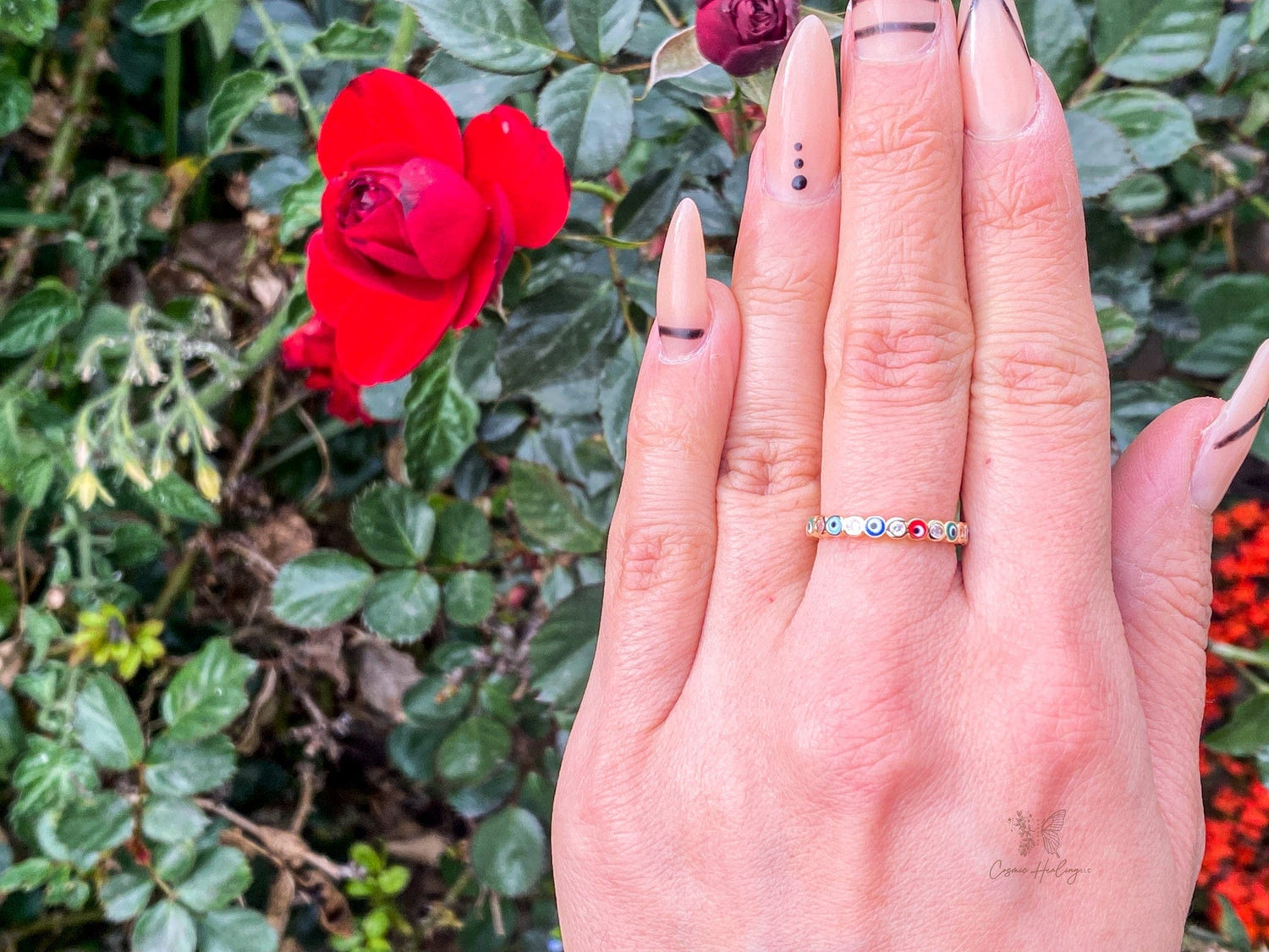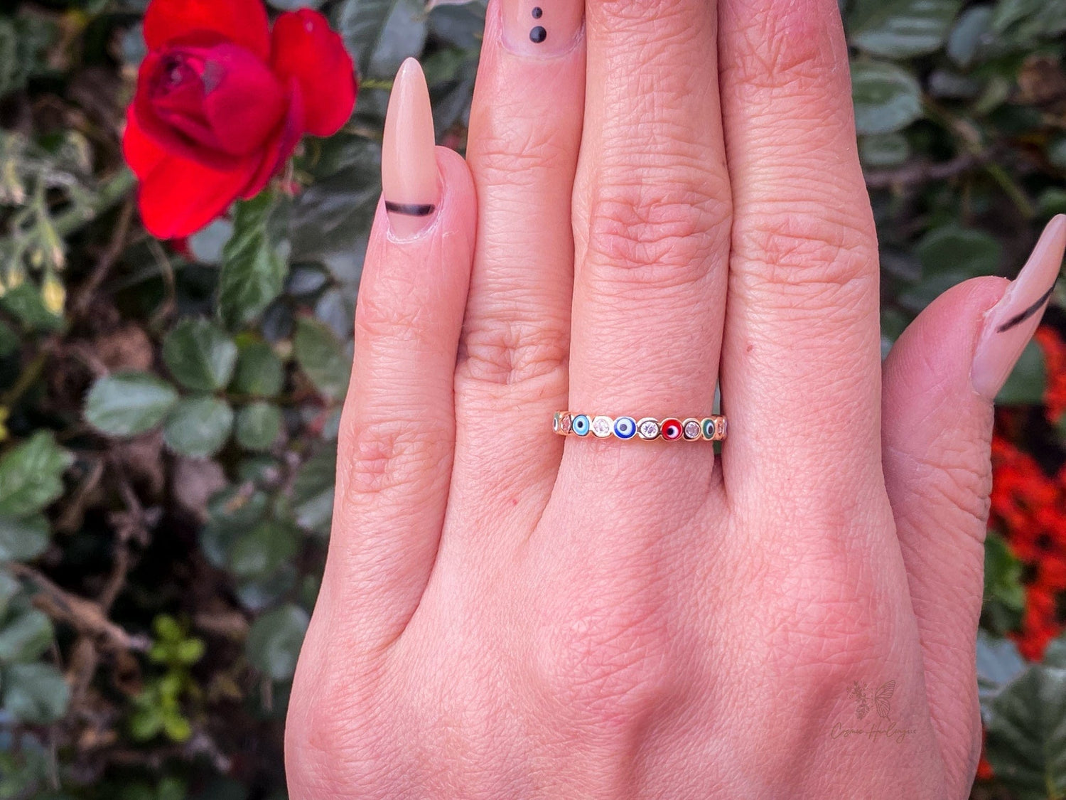 ¡El regalo perfecto para tu ser querido! Se dice que el mal de ojo es un símbolo muy poderoso y algunos lo consideran el amuleto más poderoso. Se cree que crea protección contra el "mal de ojo" o la "envidia de los demás". Este delicado anillo presenta un hermoso ojo multicolor con diamantes de imitación que nunca pasará desapercibido. ¡Lleva este anillo en tu dedo índice para lograr el máximo efecto!