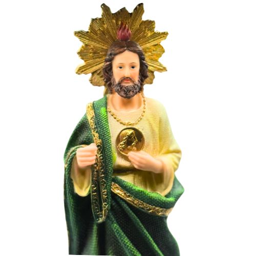 Esta hermosa estatua de San Judas es una escultura de 30 cm de alto que representa a San Judas con su bastón y monedas de oro a sus pies. Esta pieza es perfecta para la decoración del hogar, restaurantes, iglesias y más.