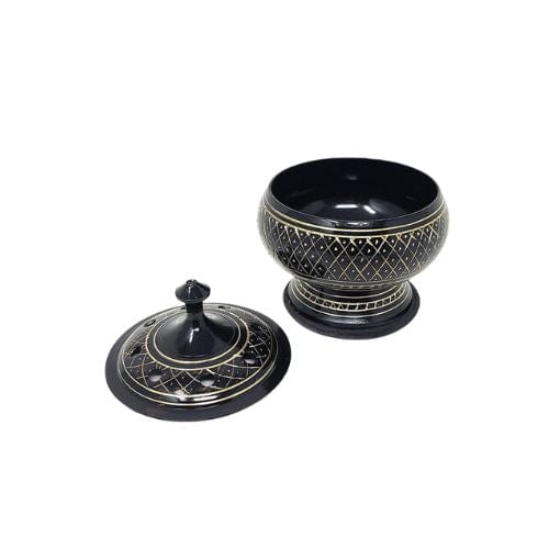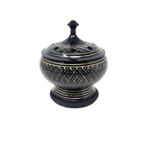 Quemador de incienso tallado en negro con posavasos y tapa de madera, 3″ de profundidad y 3,5″ de alto está agotado y se enviará tan pronto como vuelva a estar disponible.