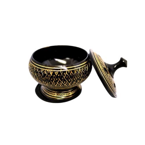 Este hermoso quemador de latón tallado en negro con diseño dorado es perfecto para cualquier hogar, oficina, dormitorio, spa o estudio de yoga. Es especialmente bueno para usar con nuestro incienso de resina aromática. El quemador se adapta a la mayoría de los conos o varillas y viene con un hermoso posavasos de madera y una tapa para quemar incienso de forma rápida y sencilla.