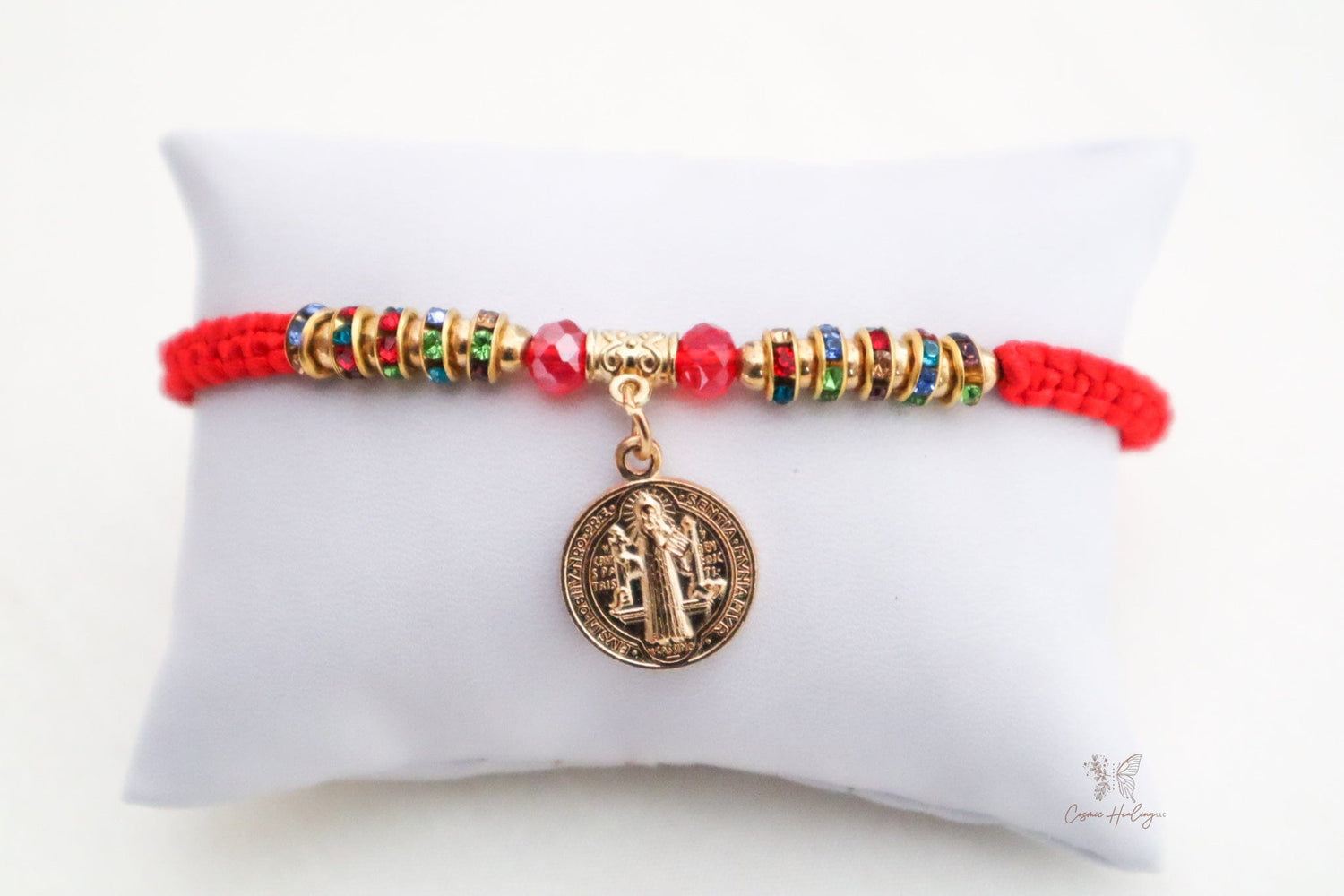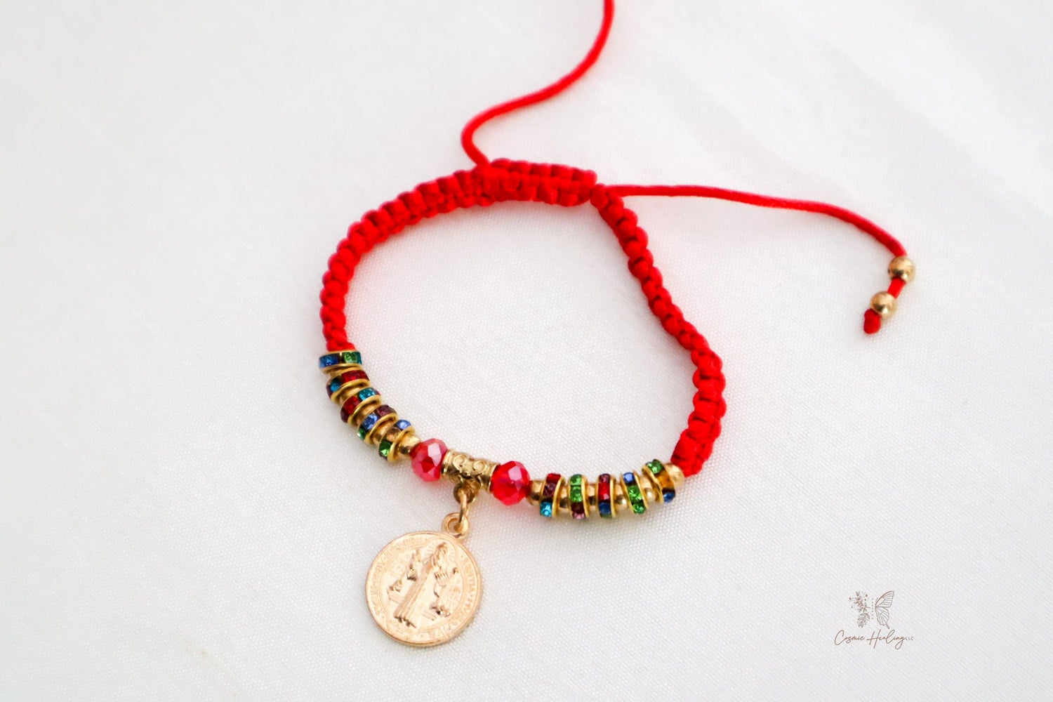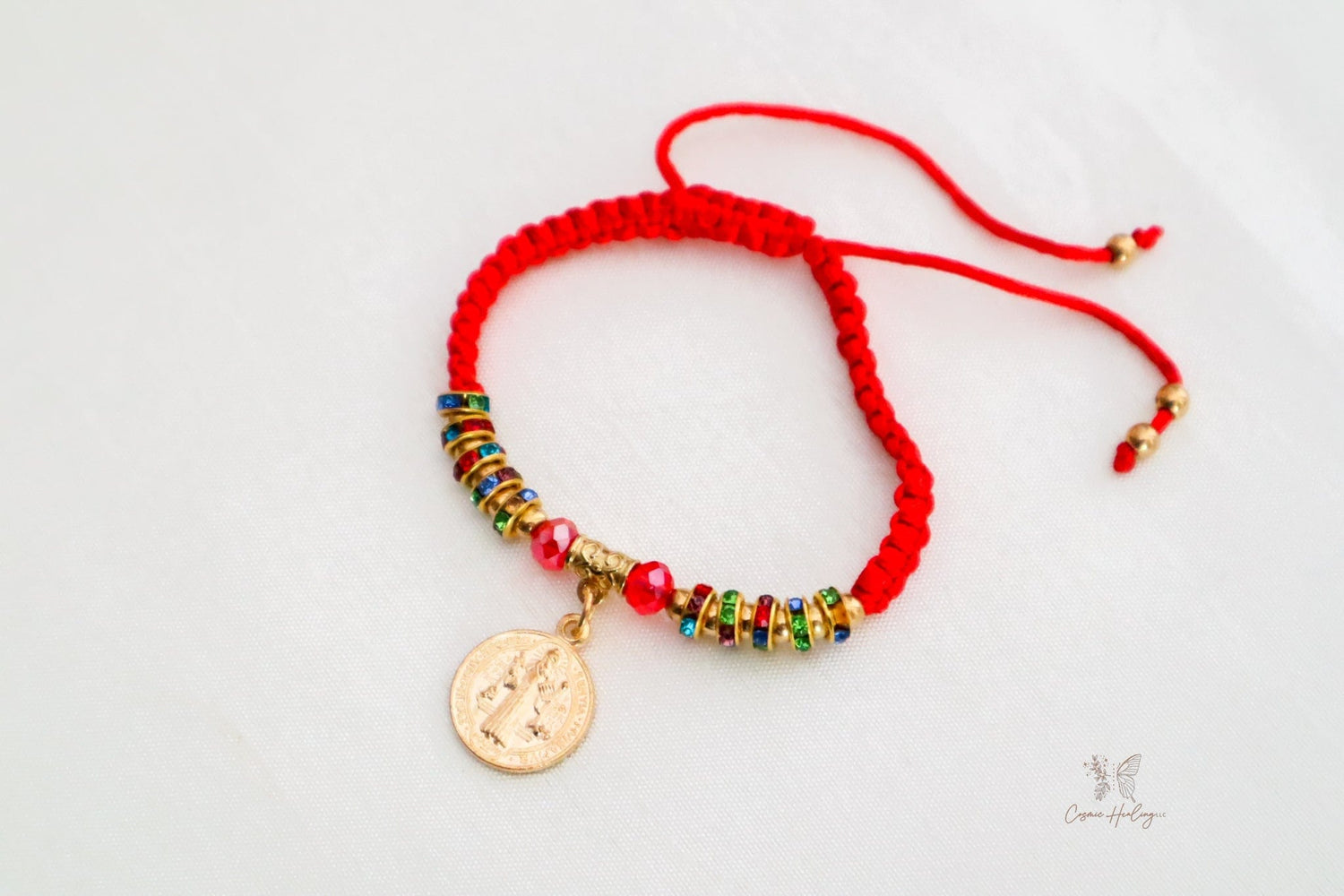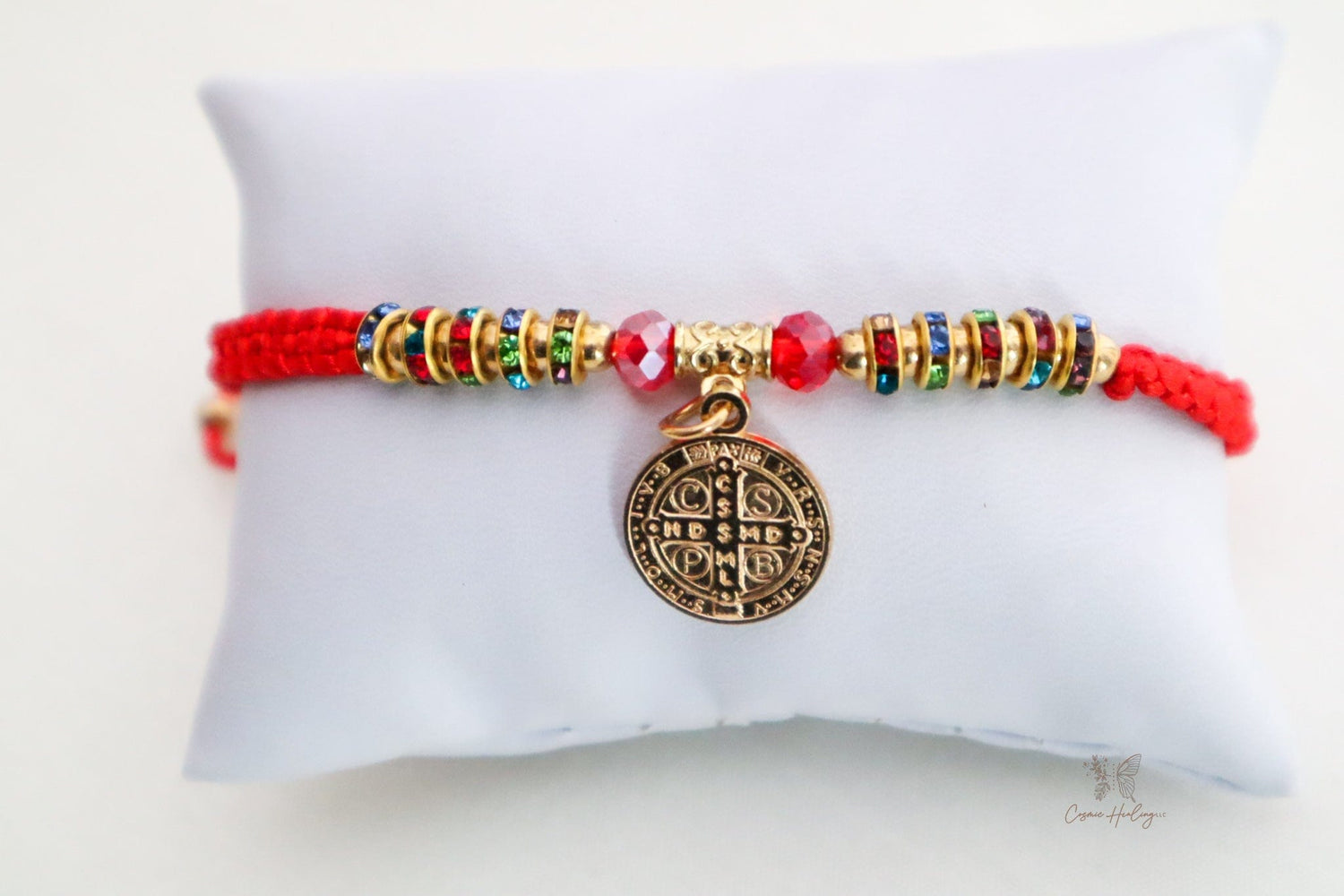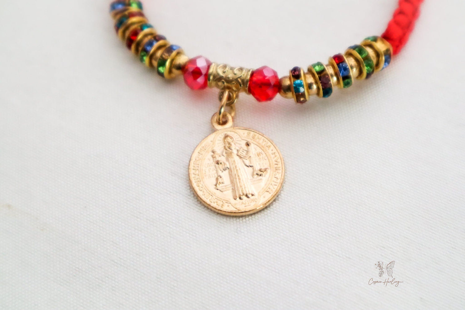 Wear your faith with this beautiful Saint Benedict Bracelet! This St. Benito bracelet features red thread nylon cord bracelet with Saint Benedict medal surrounded with rhinestones.