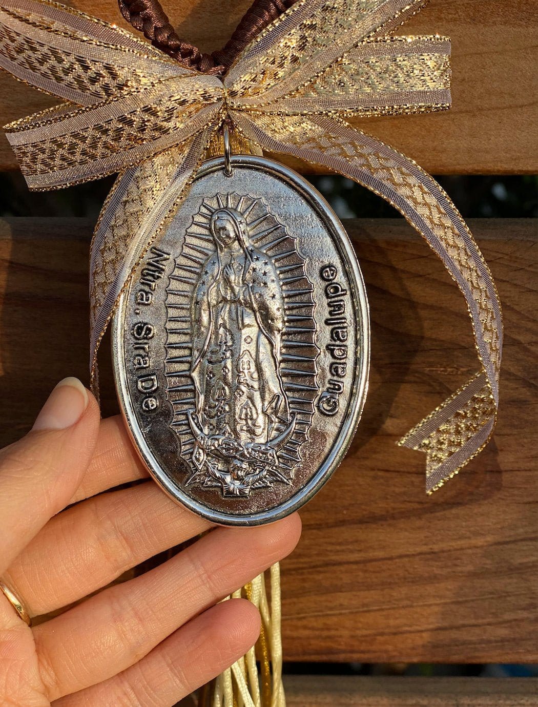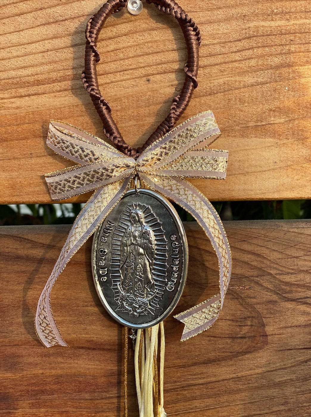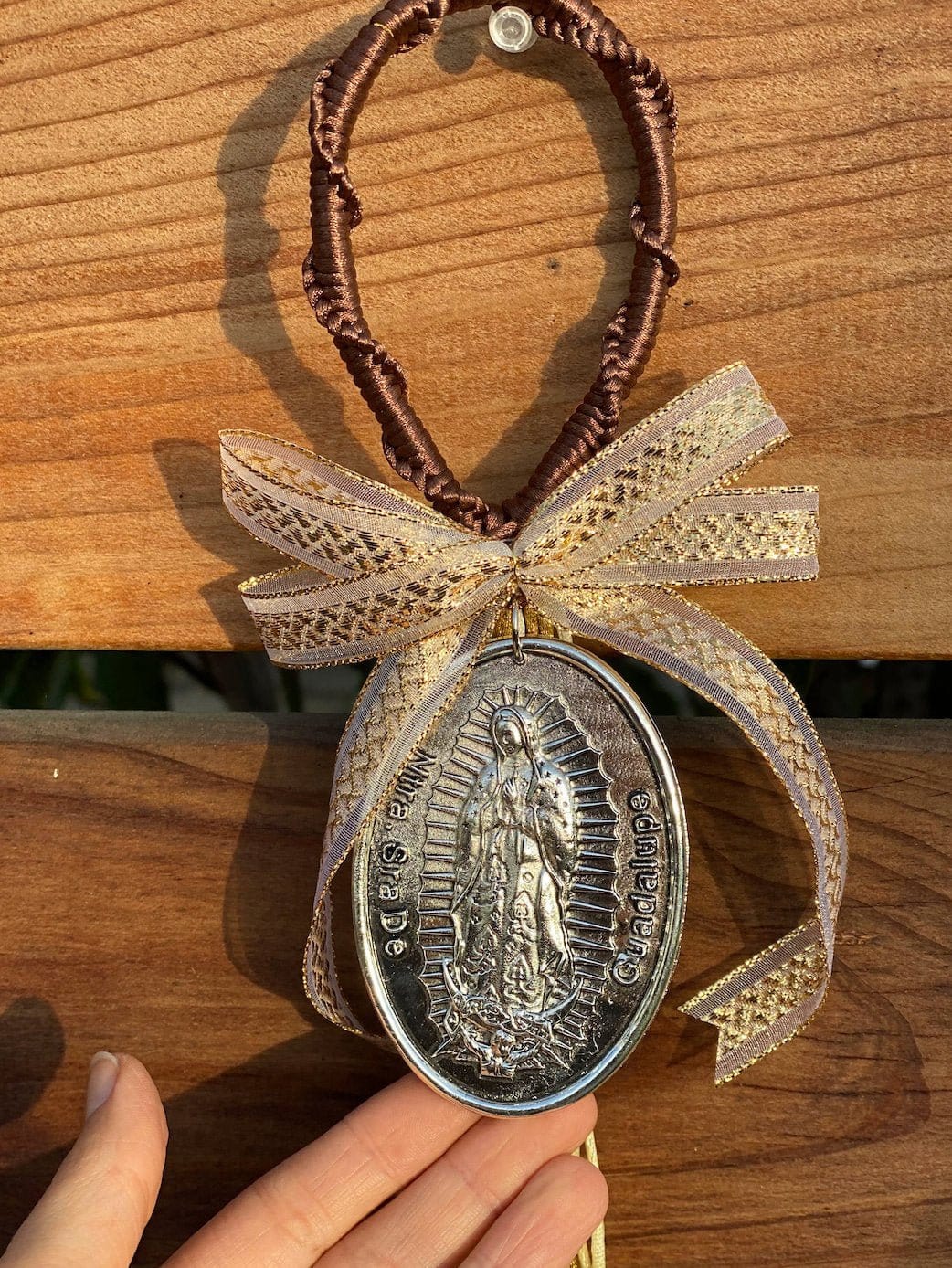 Deze Virgen-medaille is een weergave van een van de meest gevierde religieuze iconen ter wereld. Door deze medaille in uw ruimte te hangen, roept u bescherming en veiligheid op. Deze zilveren Virgen de Guadalupe-medaille met religieuze bedels is de perfecte manier om ervoor te zorgen dat uw geliefde toegang heeft tot een belangrijke heilige. De medaille is verzilverd en heeft een bruin koord met verschillende religieuze bedels en talismannen.