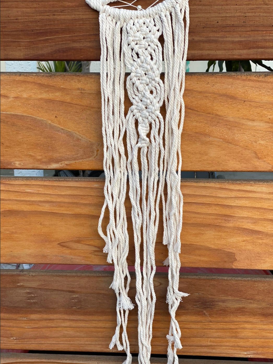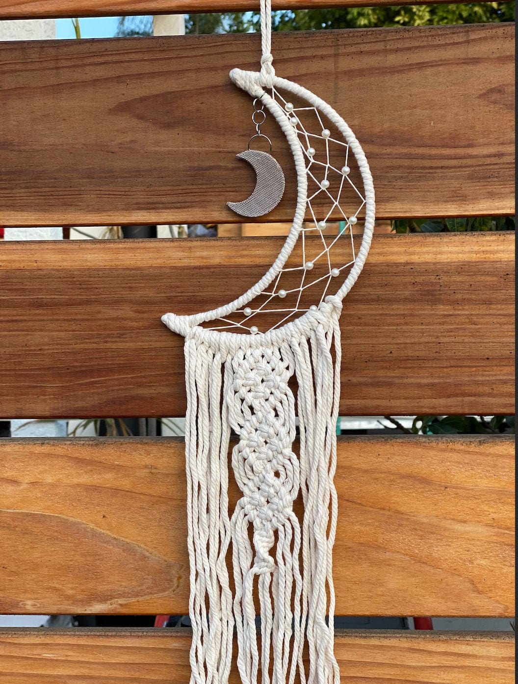 Kleur: Wit Kenmerken: 100% Handgemaakt macraméwerk op een halve maancirkel met een uniek ontwerp met een kleine maanhanger aan de bovenkant. Het is een aantrekkelijke wanddecoratie.
