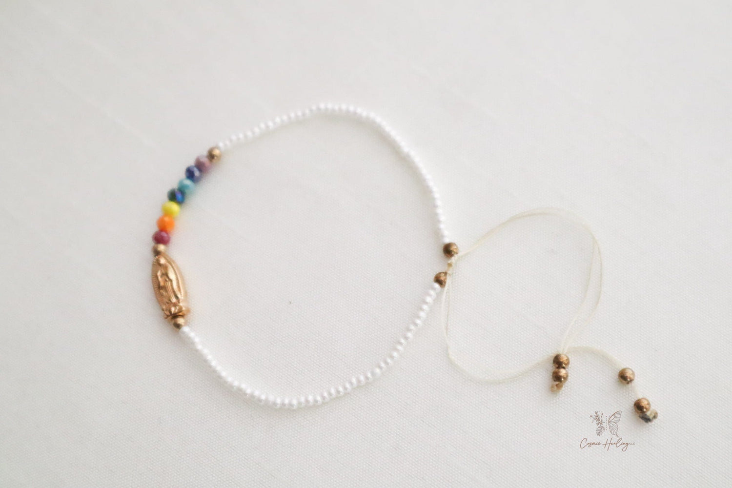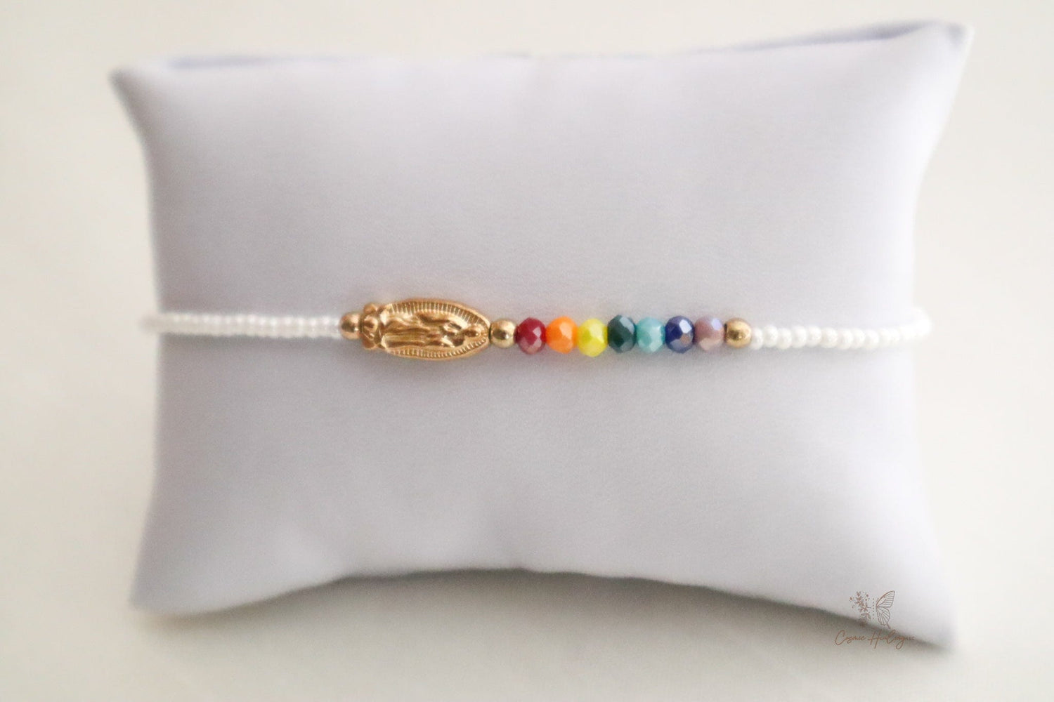 Onze Virgin of Guadalupe-armband is om trots op te zijn. Het is een statement piece dat er geweldig uitziet, alleen of met andere armbanden. Belichaam de Mexicaanse cultuur met deze unieke Guadalupe-armband die is versierd met sierlijke witte kralen en 7 kleurrijke kralen die de 7 chakra's symboliseren die een gouden medaille-afbeelding van Our Lady of Guadalupe sieren.