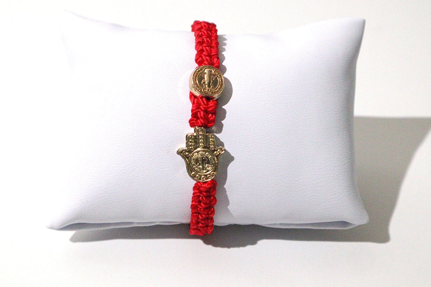 Keep the Patron Saint of Protection close to you, with this handmade St. Benedict bracelet. This bracelet also features a gold saint Benedict medal on a hand woven red thread. The bracelet is adjustable and stretches to fit most wrist sizes.