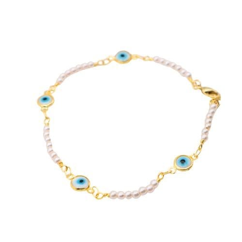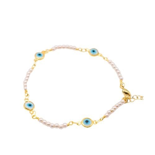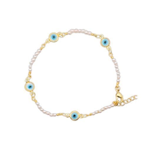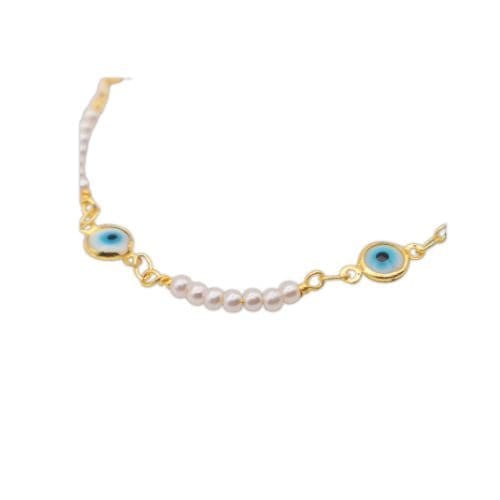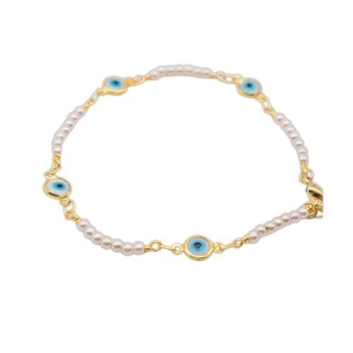 Pulsera de Oro Plateado 14K con Cuentas de Perlas y Ojo Turco de Turquesa