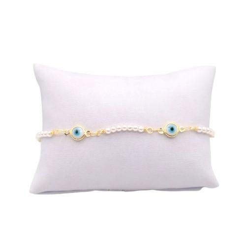 Esta hermosa pulsera combina elegancia clásica con simbolismo protector. Fabricada en acero inoxidable de alta calidad y bañada en oro de 14K, presenta cuentas de perlas simuladas que añaden un toque suave e iridiscente. En el centro, un encantador Ojo Turco en color turquesa brinda tanto un estilo único como una poderosa protección contra las energías negativas.